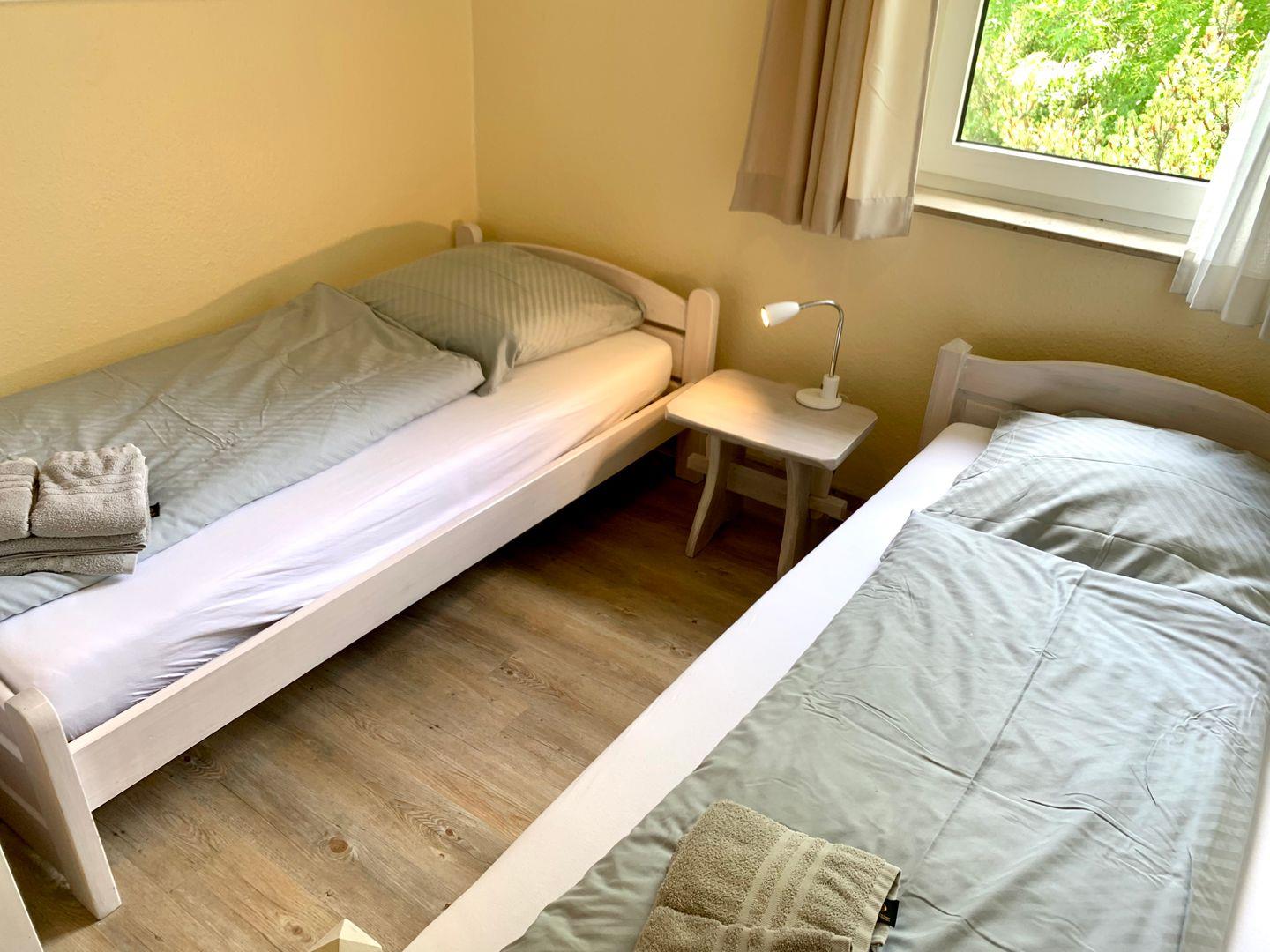 Schlafzimmer mit 2 Einzelbetten, Küchenzeile, Duschbad mit WC, Sat-TV, Radio,