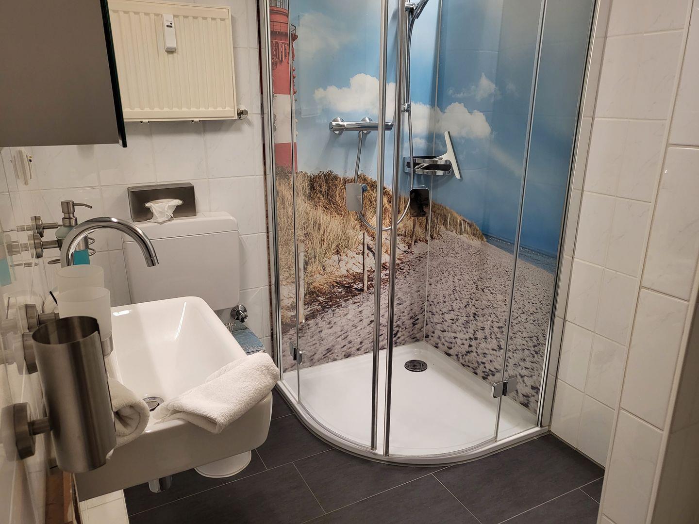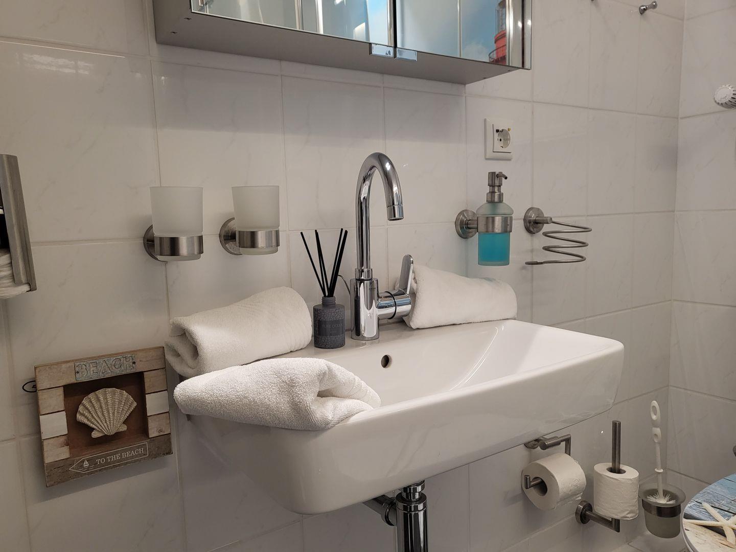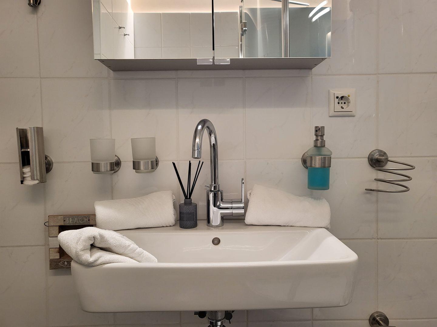 Zum Appartement gehört ein modernes Duschbad mit beleuchtetem Spiegel, einem elektrischen Handtuchtrockner und einem Haartrockner.