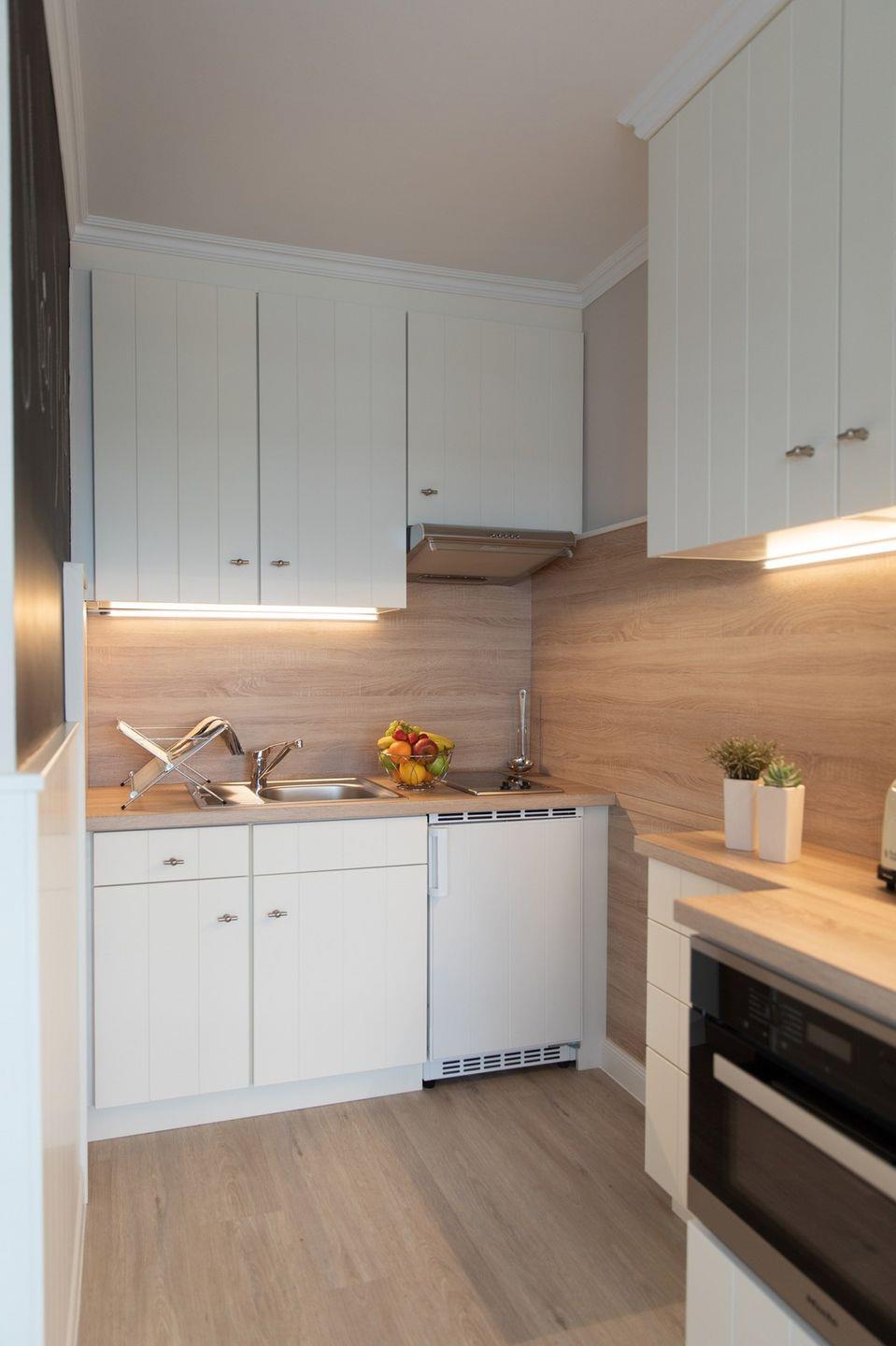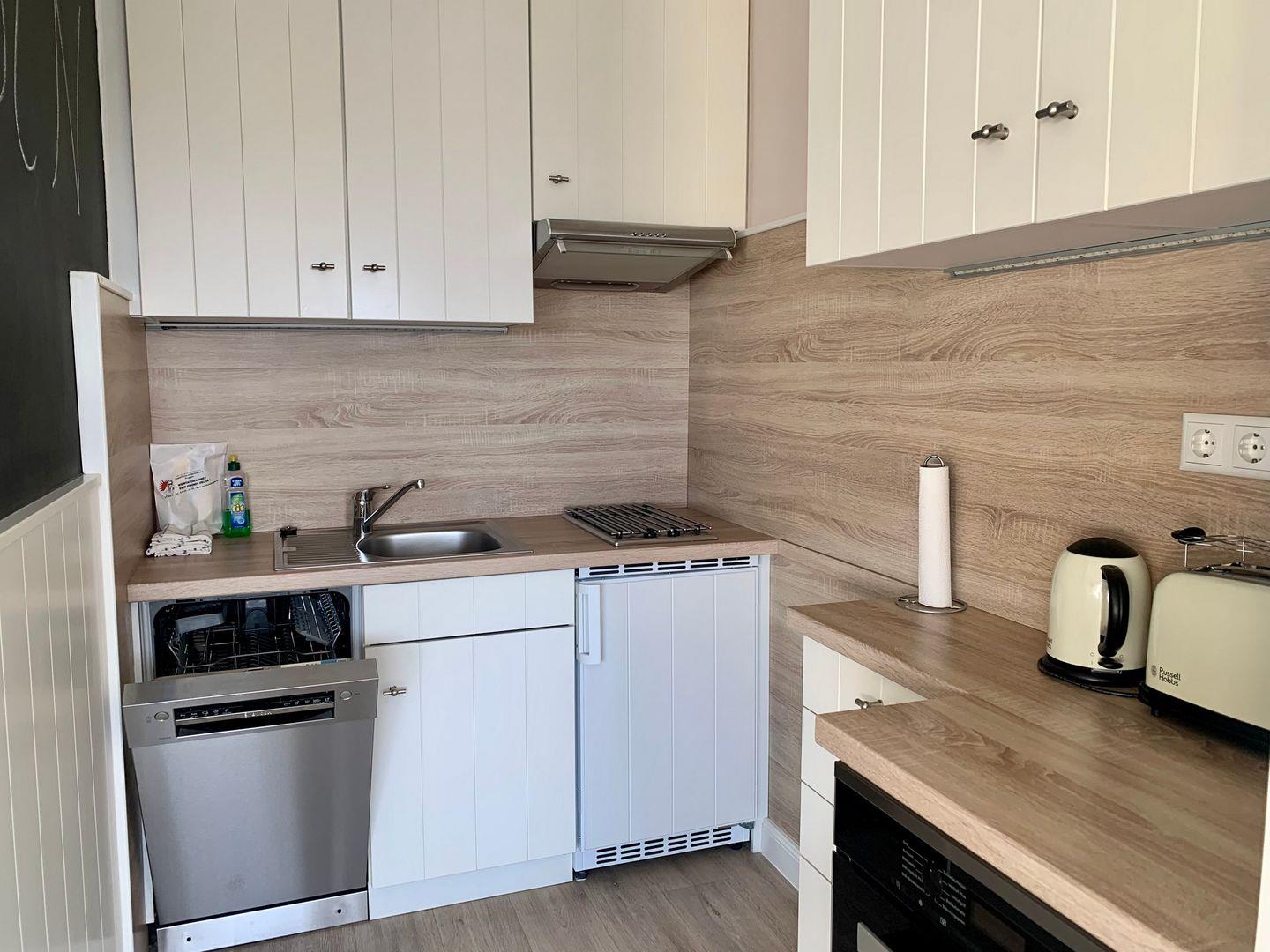 Kompakt, modern und gut ausgestattet präsentiert sich die Küchenzeile der Ferienwohnung. Zur Ausstattung gehören neben einem kompakten Kochfeld unter anderem ein Kühlschrank mit Gefrierfach, ein Geschirrspüler, ein Mikrowellenofen sowie Toaster und Kaffeemaschine. Außerdem gibt es eine Espresso-Maschine von Caffisimo. Kapseln hierfür müssen selber mitgebracht werden.