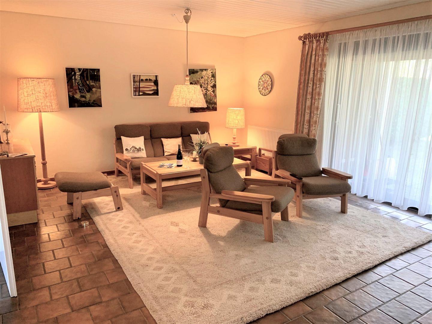 Rustikale Ferienhaus DHH mit Garten und Terrasse für 4 Personen. Großes, helles Wohnzimmer mit Sitzgelegenheiten und großem TV.