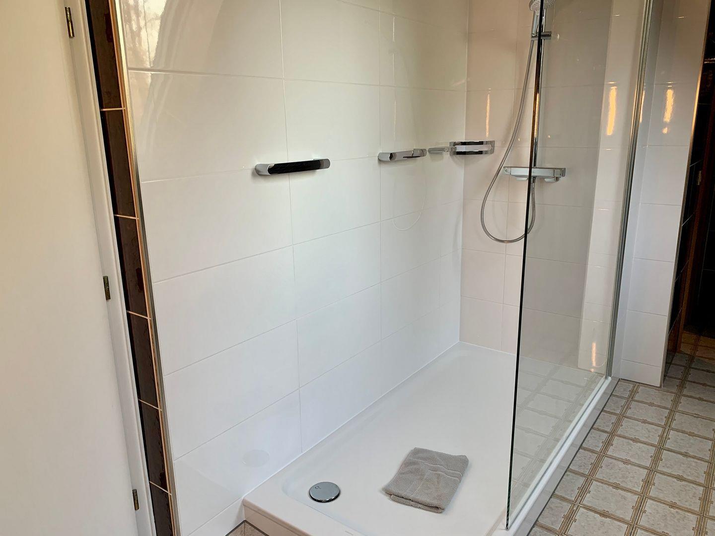Im großen Badezimmer des Ferienhauses steht eine Dusche mit ebenerdigem Einstieg und ein WC bereit.