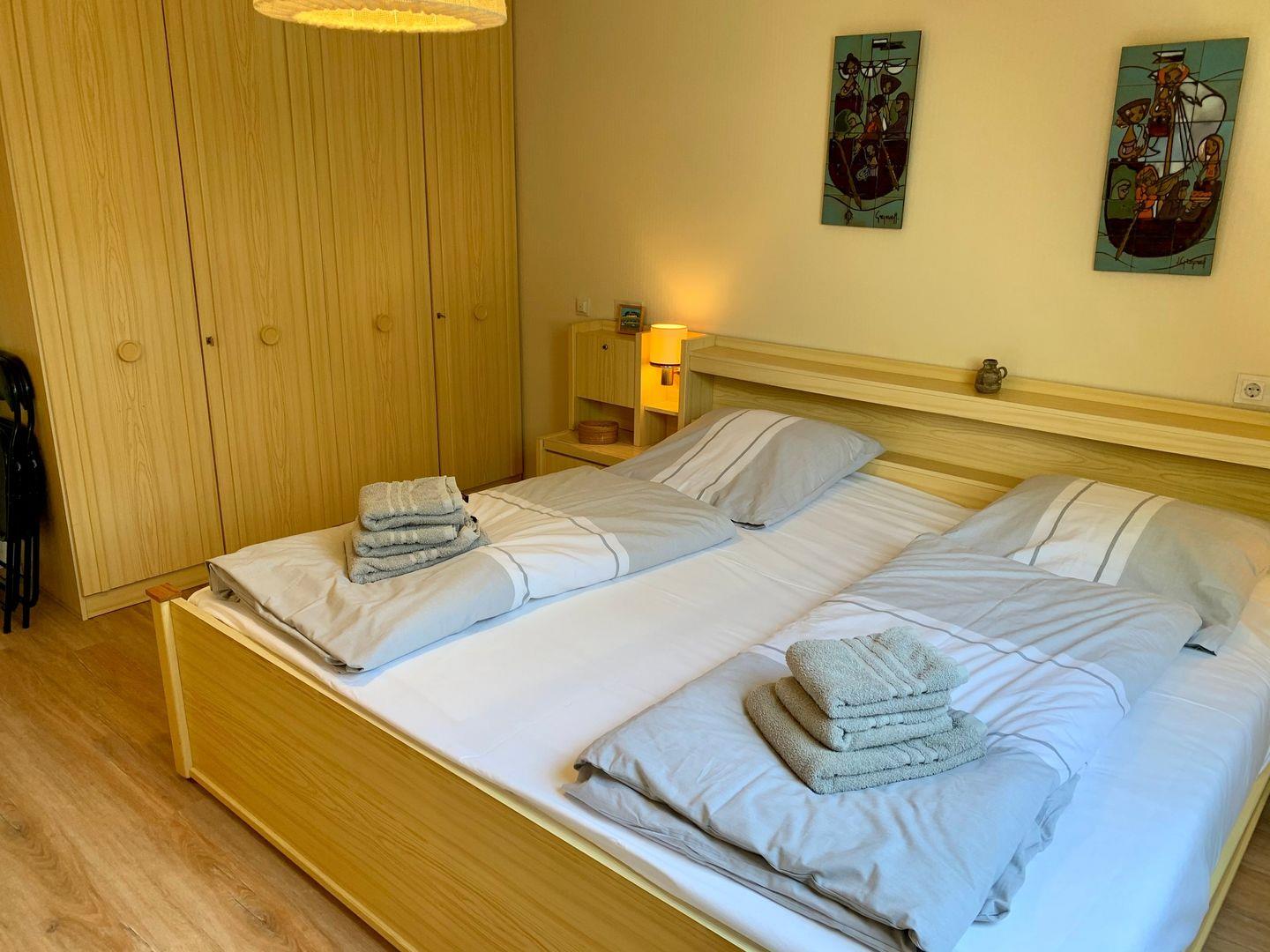 Ausgestattet mit separater Küche zwei Schlafzimmern. Eines mit Doppelbett, das Zweite mit 2 Einzelbetten. Ein Duschbad mit WC sowie ein Gäste-WC vorhanden.