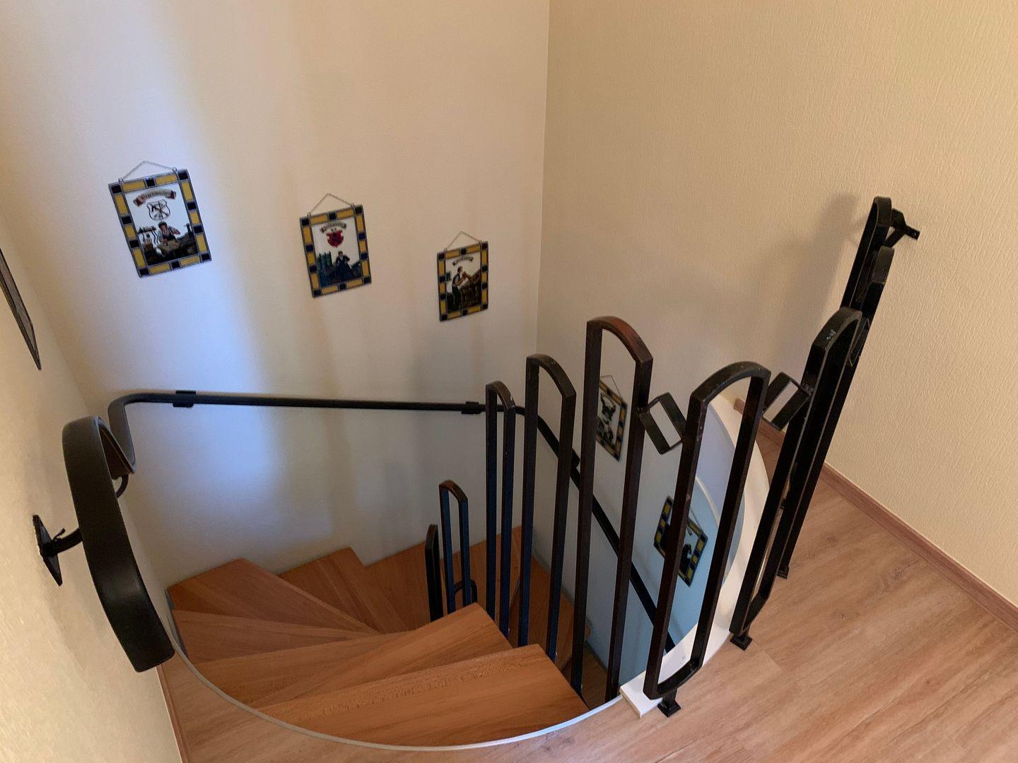 Über die Wendeltreppe gelangt man in das Obergeschoss, welches über zwei separate Schlafzimmer verfügt.