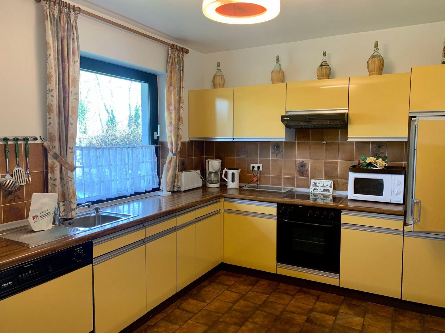 Hier gehören unter anderem Cerankochfeld und Backofen, ein Kühlschrank sowie Kaffeemaschine und Geschirrspüler zur Ausstattung.