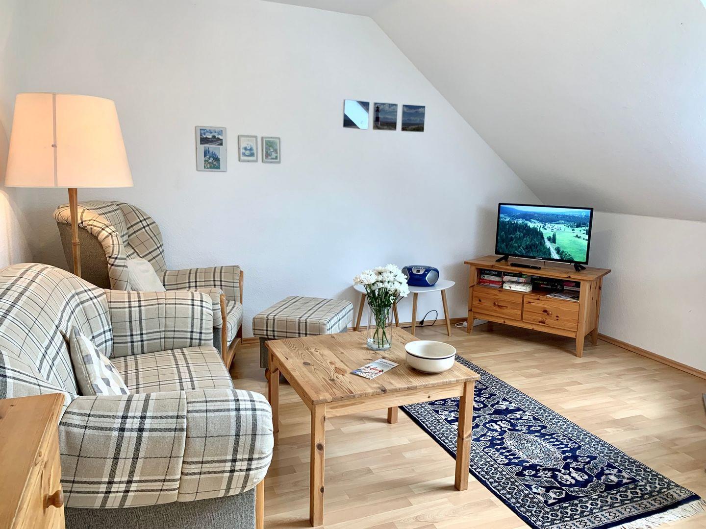Der Wohnraum ist ausgestattet mit einer gemütlichen Sitzgruppe, Esstisch und Flachbild-TV. Kostenfreies W-LAN steht zur Verfügung.