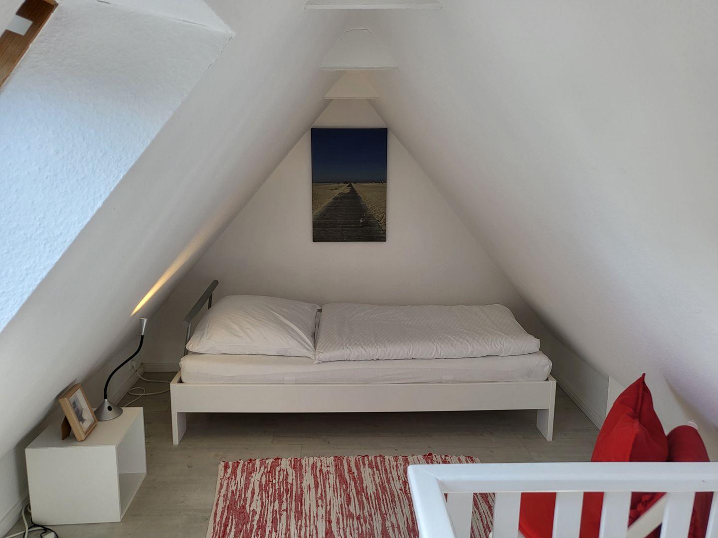Das Schlafzimmer im Dachgeschoss kann außerhalb der Heizperiode genutzt werden, während der Heizperiode bietet die Schlafcouch im Wohnzimmer zwei Schlafplätze.