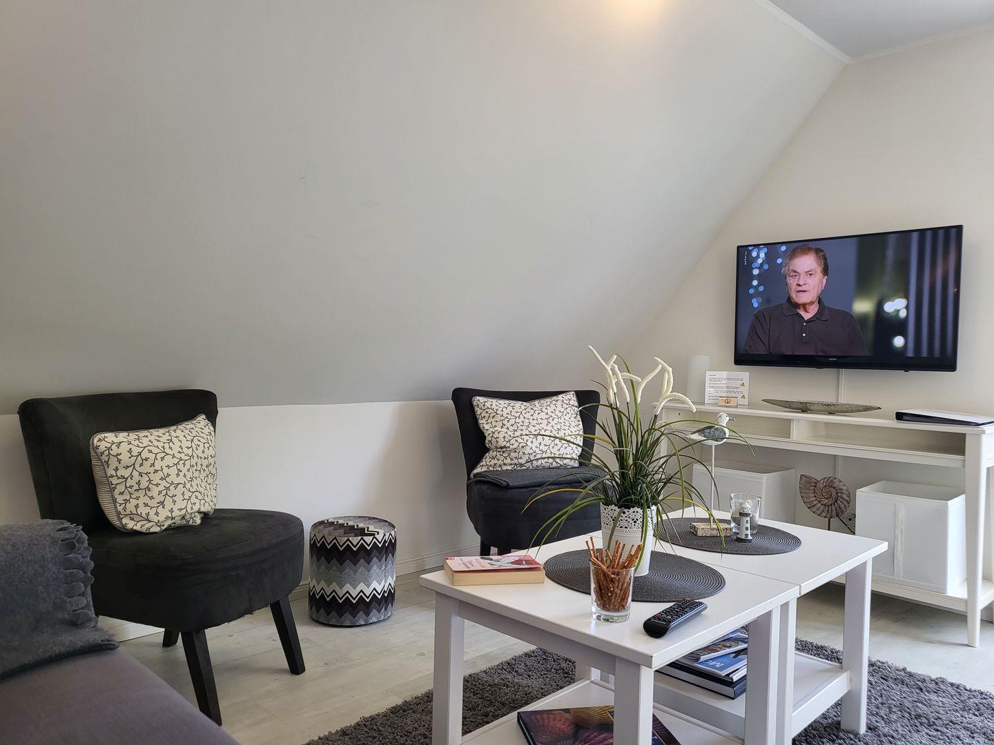Am geräumigen Esstisch ist Platz für die gesamte Familie, für die multimediale Unterhaltung sorgen ein modernen Flachbild-TV und kostenfreies W-LAN.