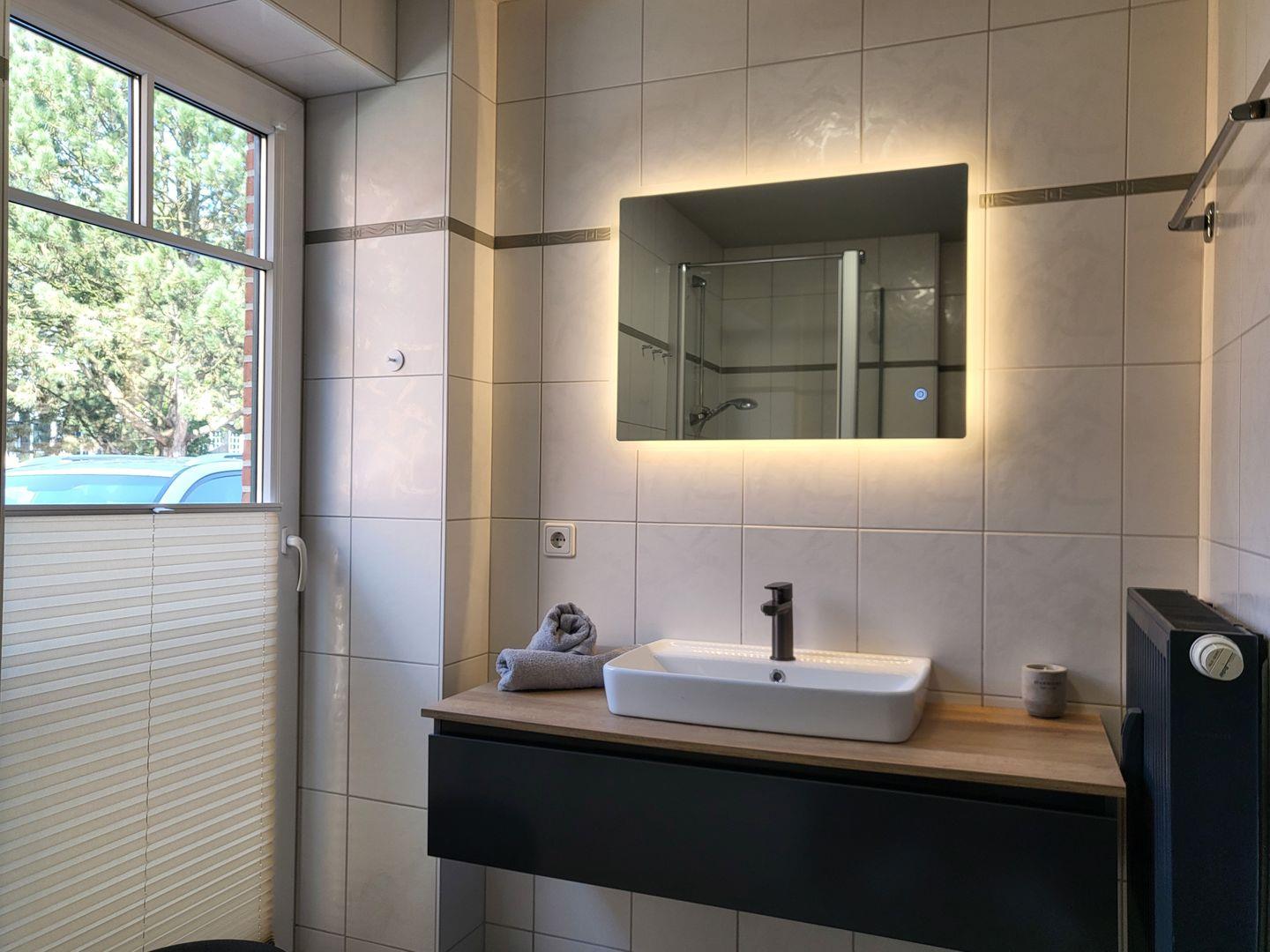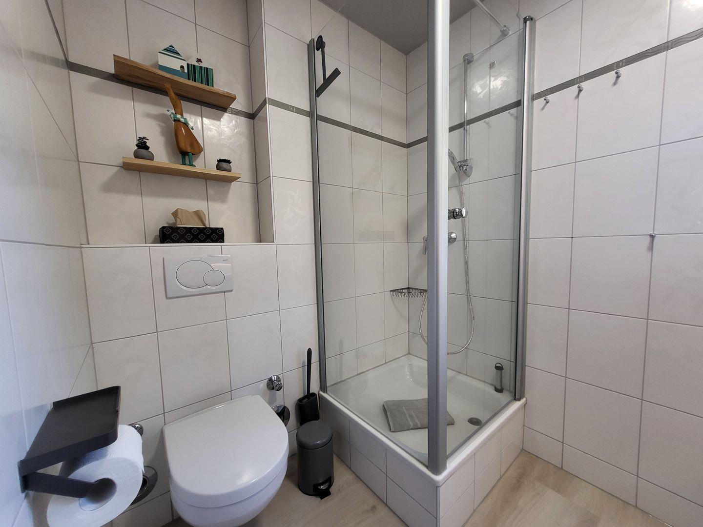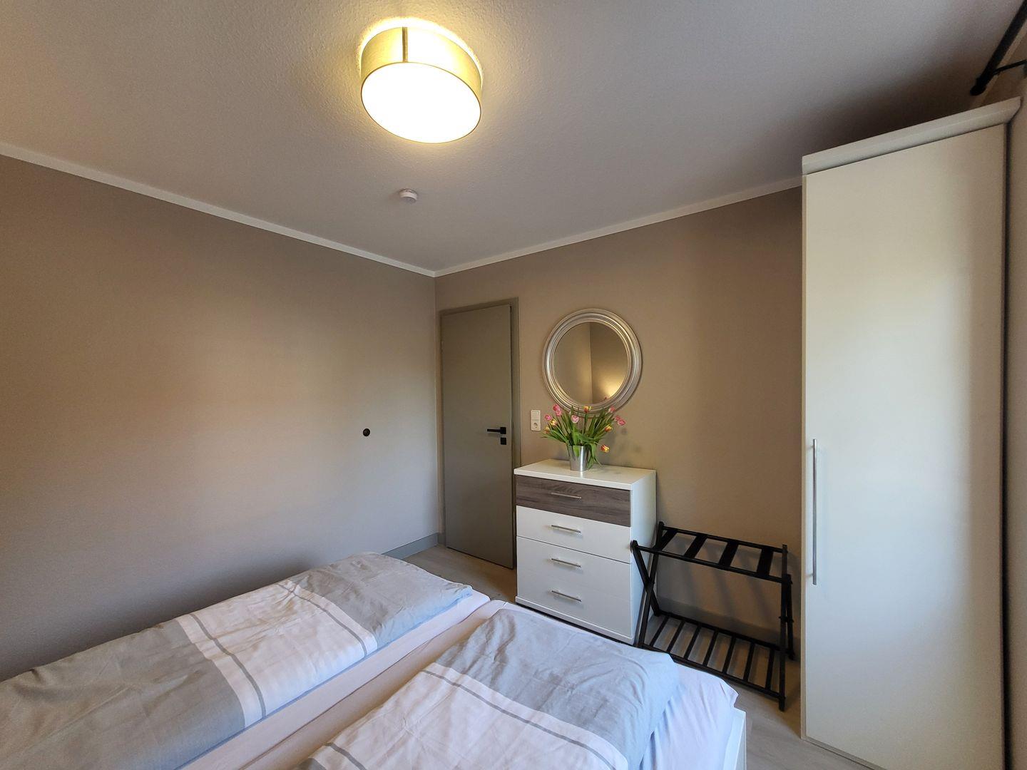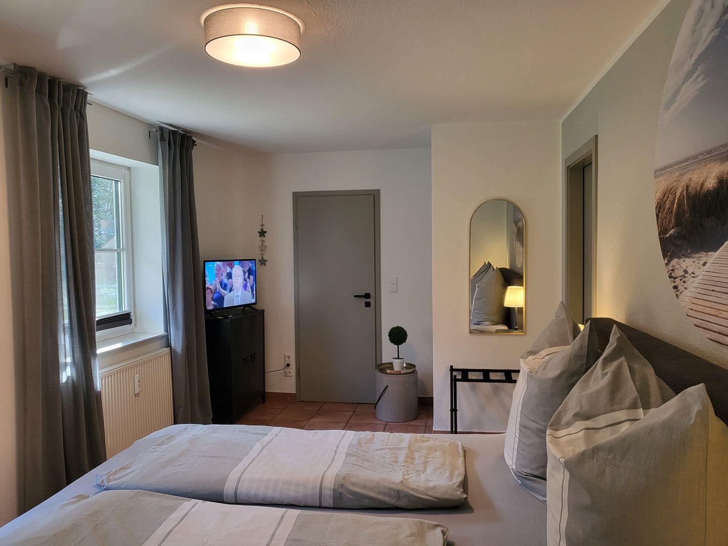 Ein Schlafzimmer mit 180x200cm Doppelbett sowie ein geräumiges Duschbad mit WC befinden sich ebenfalls im Erdgeschoss. Im großzügig gehaltenen Souterrain befindet sich das zweite Schlafzimmer der Ferienwohnung, dort steht ein 180x200cm Doppelbett sowie ein eigener Flachbild-TV bereit. Ein weiteres Duschbad befindet sich ebenfalls im Souterrain.