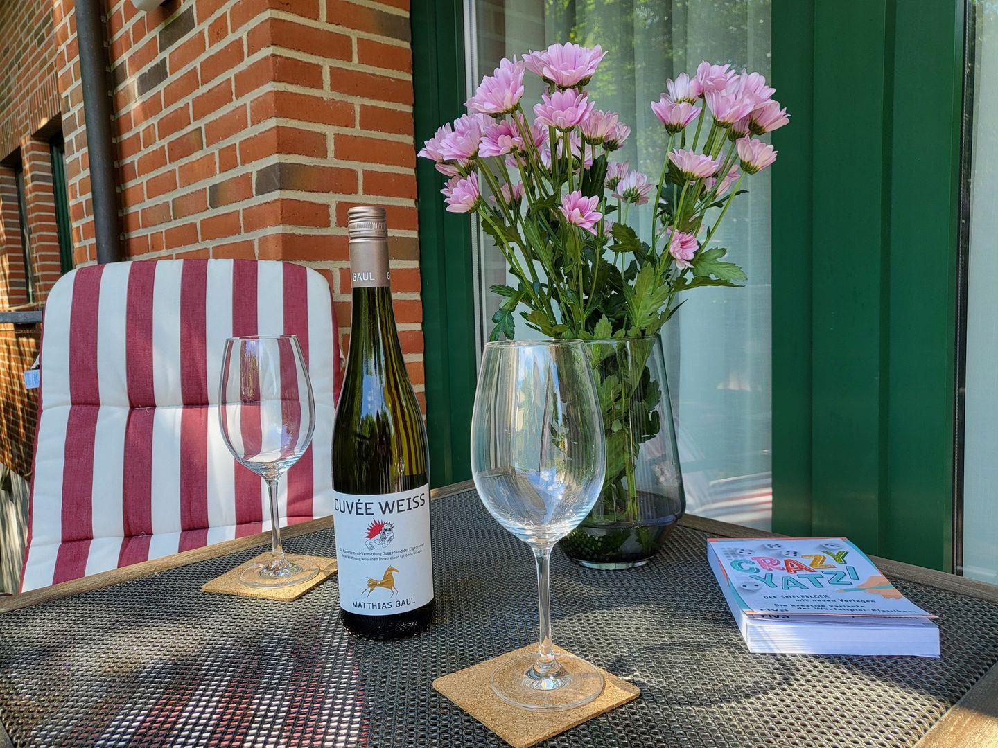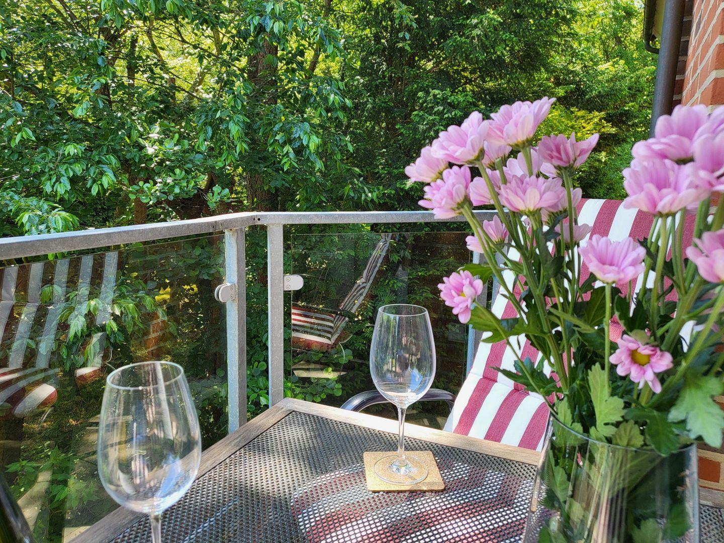 Zur Ferienwohnung gehört ein windgeschützter, möblierter Balkon der gemeinsames Frühstücken in der Morgensonne ermöglicht.