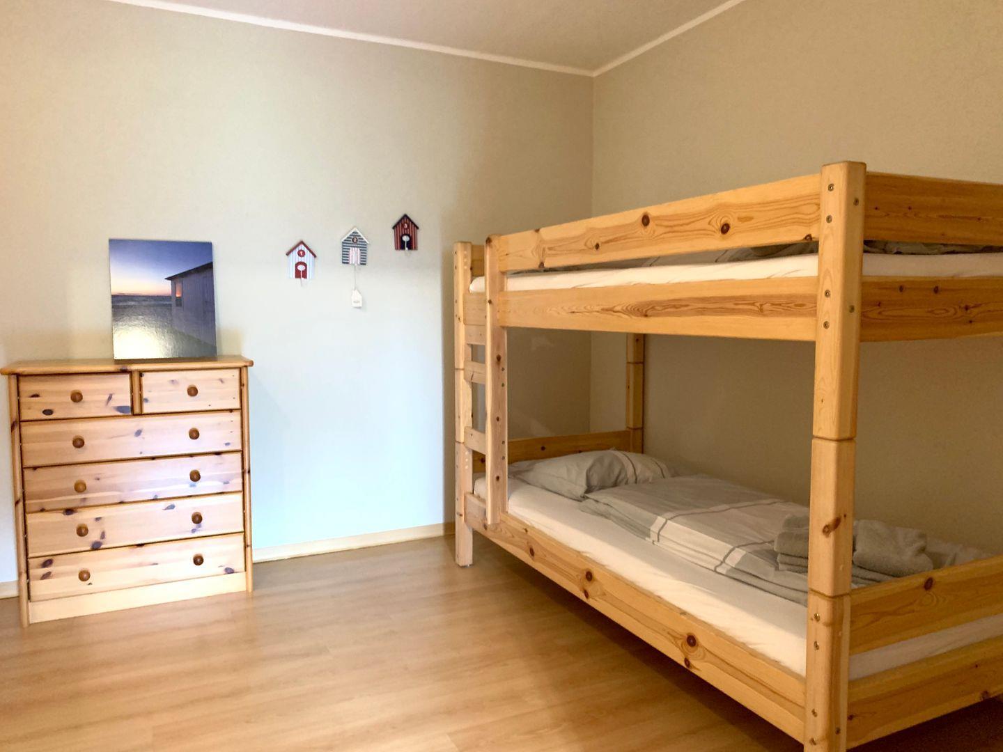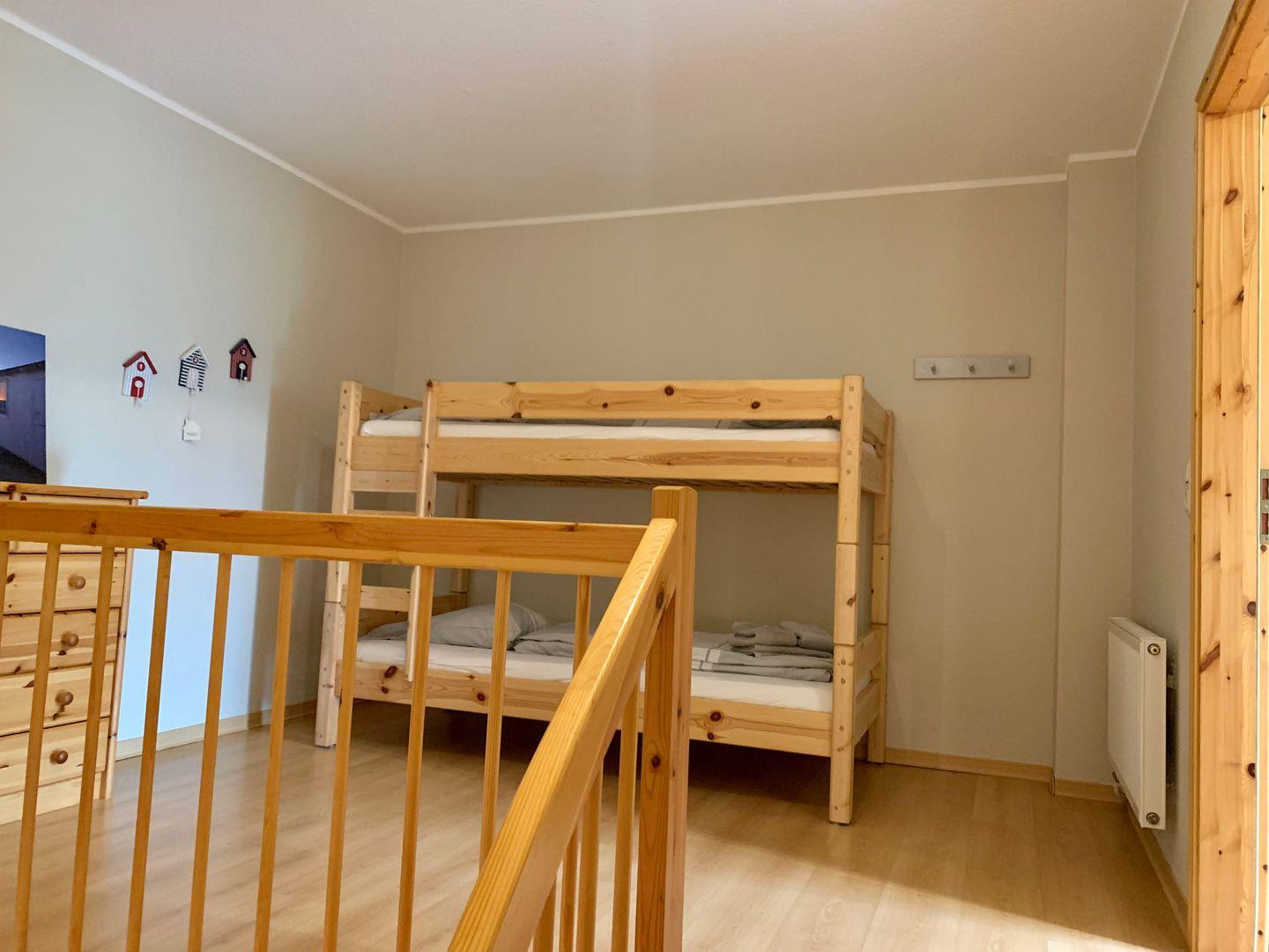 Ein Schlafzimmer ist mit komfortablem 180x200cm Doppelbett ausgestattet, auf der Galerie zum Flur steht ein Etagenbett zur Verfügung.