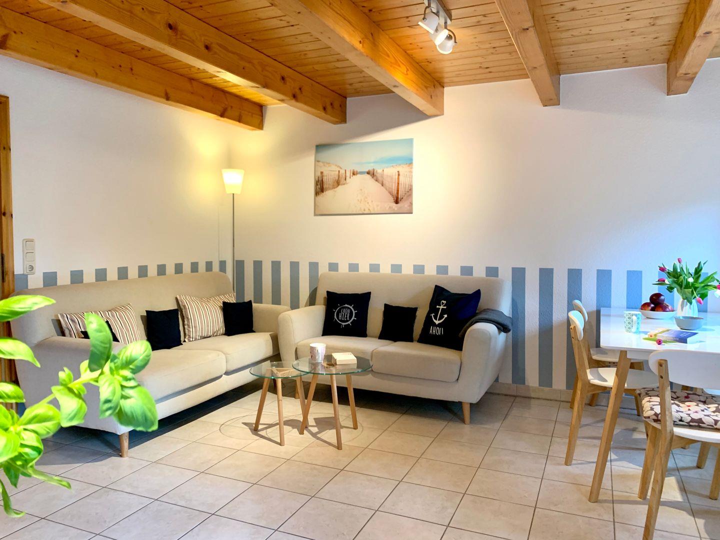 Das freundlich und maritim eingerichtete Wohnzimmer ist mit einer gemütlichen Couch sowie einem ansprechenden Essbereich ausgestattet.