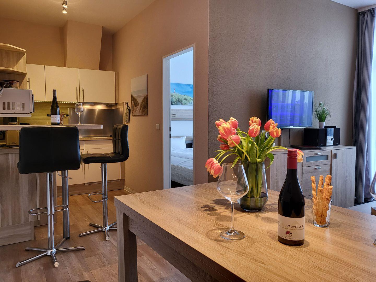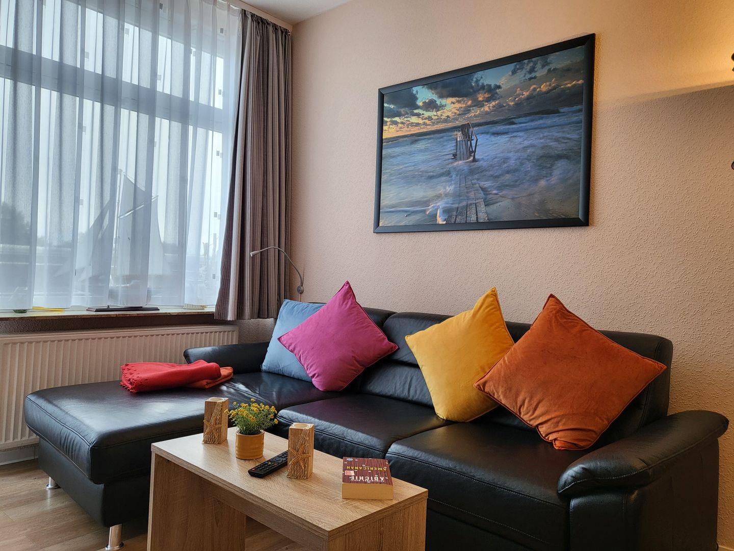Zentrale 2-Zimmer Penthousewohnung im 3. OG für bis zu 3 Personen. Balkon mit Strandkorb. Wohnraum mit Schlafcouch und intregrierter Küchenzeile.