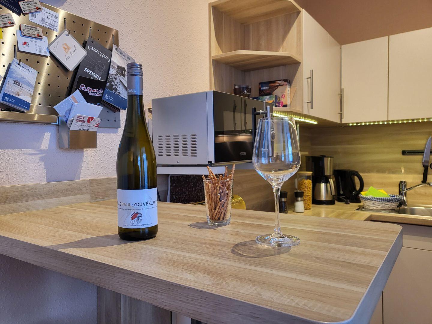 Die angrenzende, offene Küche ist sehr gut ausgestattet. Hier stehen unter anderem Cerankochfeld, Kühlschrank, ein Geschirrspüler sowie Mikrowelle und Kaffeemaschine zur Verfügung. Ein kleiner Tresen mit Sitzgelegenheiten ist ebenfalls vorhanden. Das separate Schlafzimmer des Penthouses ist ausgestattet mit einem komfortablen 160x200cm Doppelbett. Das Badezimmer ist mit einer geräumigen Regendusche und einem WC ausgestattet, Föhn und Handtuchtrockner stehen zur Verfügung. Diese Wohnung kann den Fahrstuhl nutzen.