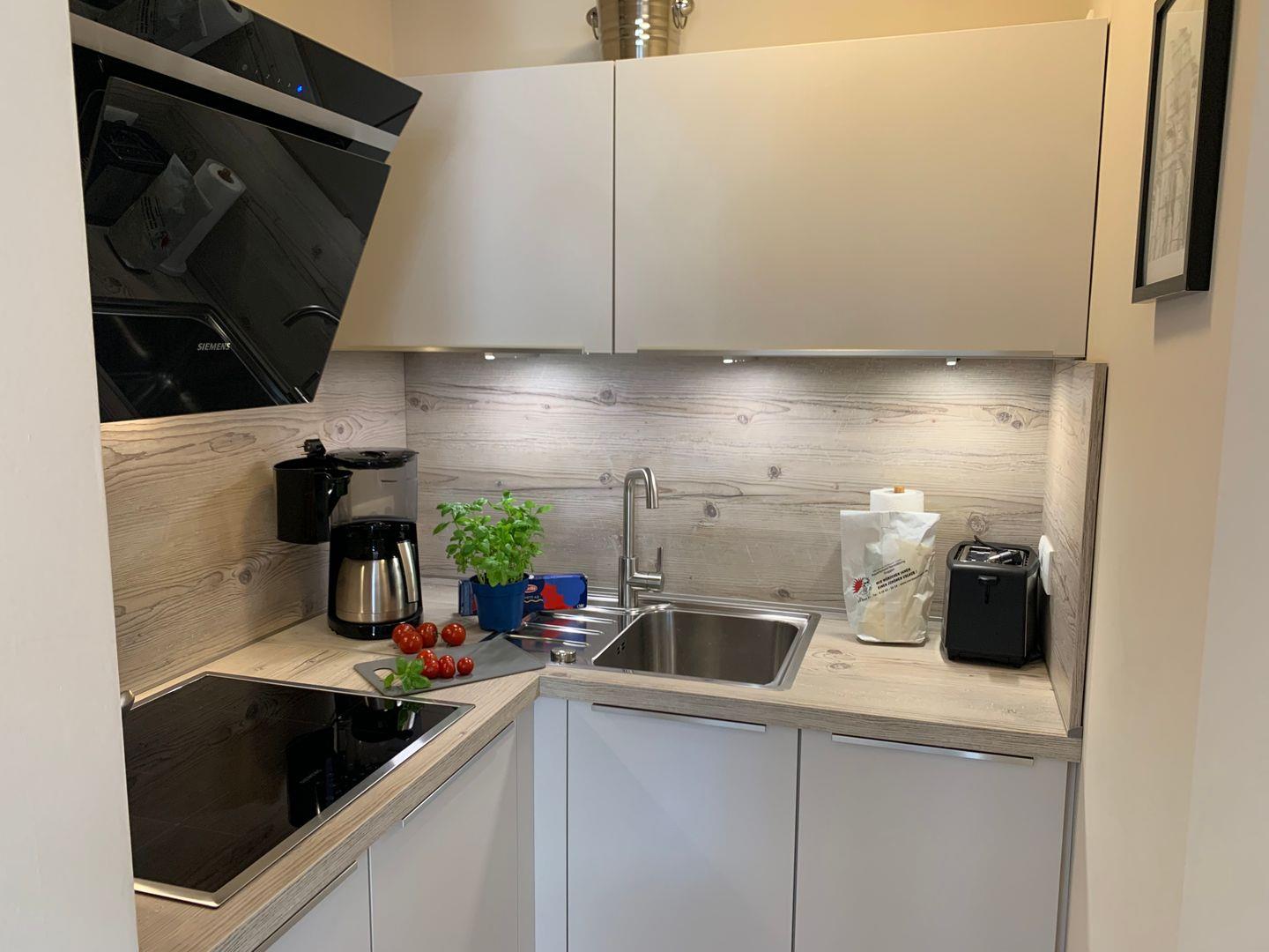 Die angrenzende, halboffene Küche ist kompakt und praktisch gehalten, bietet jedoch alles, was für kleine Mahlzeiten im Urlaub gebraucht wird. Die Küche ist sehr gut ausgestattet und verfügt unter anderem über ein Induktionskochfeld und Backofen, Geschirrspüler, Kühlschrank mit Gefrierfach sowie eine Kaffeemaschine für den morgendlichen Muntermacher.