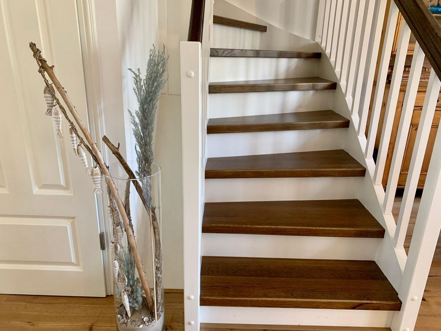 In den Raum integriert liegt die Komfort-Küche der Ferienwohnung. Dort bietet ein edler Tresen mit Barhockern einen gesonderten Sitz- und Essbereich. Zur hochwertigen Ausstattung der Küche gehören unter anderem Induktionskochfeld und Backofen, Kühlschrank mit Gefrierfach, Geschirrspüler und eine Kaffeemaschine. Eine hochwertige Espressomaschine mit Siebträger ist ebenfalls vorhanden. Im Erdgeschoss ist weiterhin ein Gäste-WC vorhanden, dort sind Waschmaschine und Trockner vorhanden.
