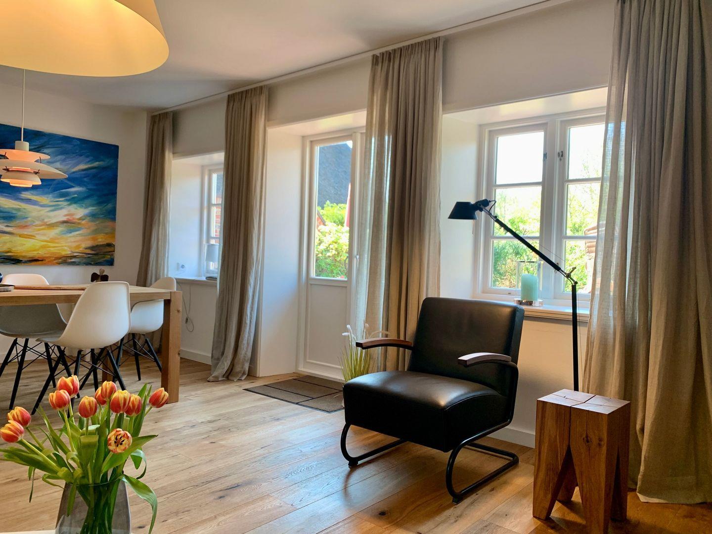 Hochwertige Ausstattung und Einrichtung, hochwertige Federkernmatratzen in jedem Bett (Sept. 2025), PKW-Stellplätze (Nr.5 / Nr 5.) vorhanden, W-LAN vorhanden , Fahrradständer vorhanden , 1 Hund auf Anfrage. Strandkorb vorhanden. Waschmaschine, Trockner und Bügelzubehör vorhanden. Kinderhochstuhl und Babybett vorhanden. Familienfreundlich, kinderfreundlich, hundefreundlich. Grillen und offenes Feuer wegen des Reetdaches verboten.