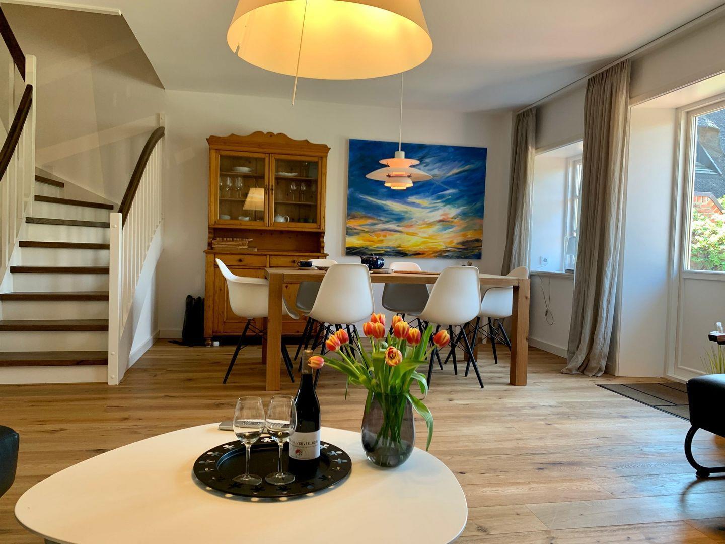 Die sehr moderne 3-Zimmer Ferienwohnung erstreckt sich vom Erdgeschoss aus auf 2 Ebenen und bietet auf großzügigen 111m² Platz für bis zu 6 Personen. Durch Lage und Ausstattung eignet sich die Ferienwohnung auch besonders für den Familienurlaub, Kinder sind hier herzlich willkommen. Auch der Urlaub mit Hund in St. Peter Ording ist hier auf Anfrage möglich. Zur Ferienwohnung gehört eine möblierte Terrasse, in der Saison steht hier ein typisch norddeutscher Strandkorb zur Verfügung. Durch den Übergang zur möblierten Terrasse wirkt der moderne Wohnraum wunderbar hell und einladend. Dort gehört eine Sitzgruppe aus edlen Ledermöbeln zur Einrichtung. Am großen Esstisch findet die gesamte Familie Platz, für die multimediale Unterhaltung sorgen Flachbild-TV und kostenfreies W-LAN. Eine hochwertige Bluetooth-Box ist vorhanden. Der edle Fußboden aus Eichenholz überstreicht das besondere Flair der Ferienwohnung.