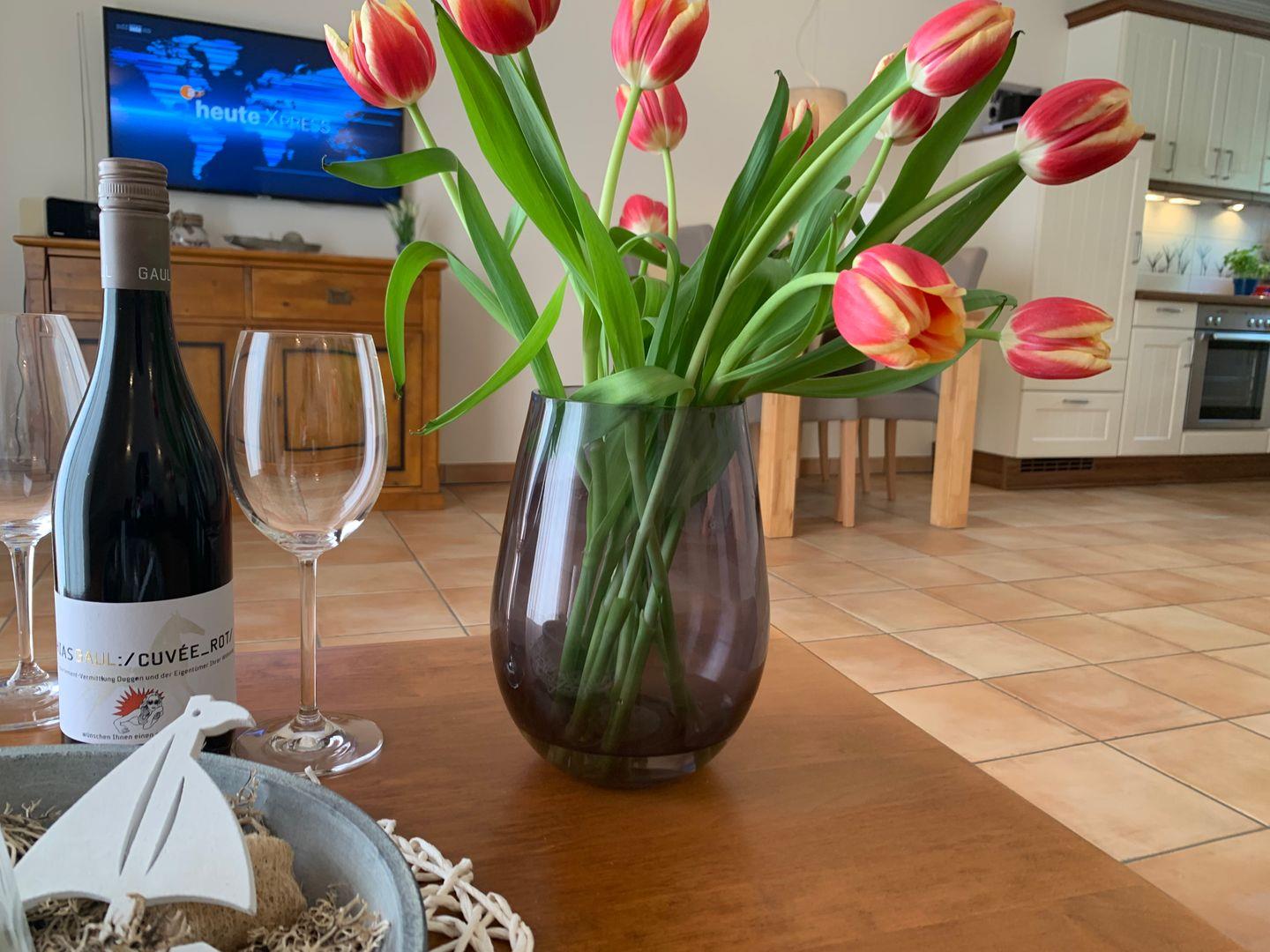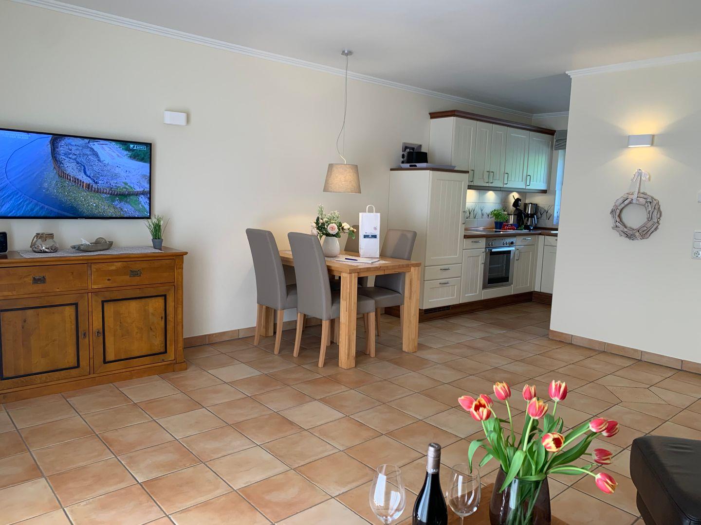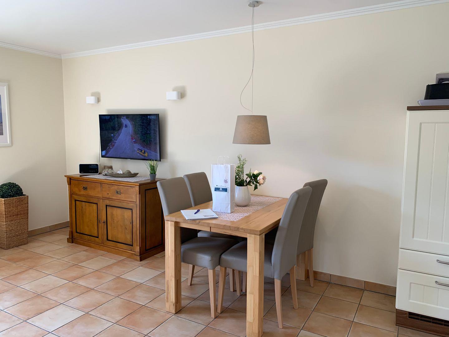 Am Esstisch nimmt die gesamte Familie Platz, für die multimediale Unterhaltung sorgen ein großer Flachbild-TV und kostenfreies W-LAN.