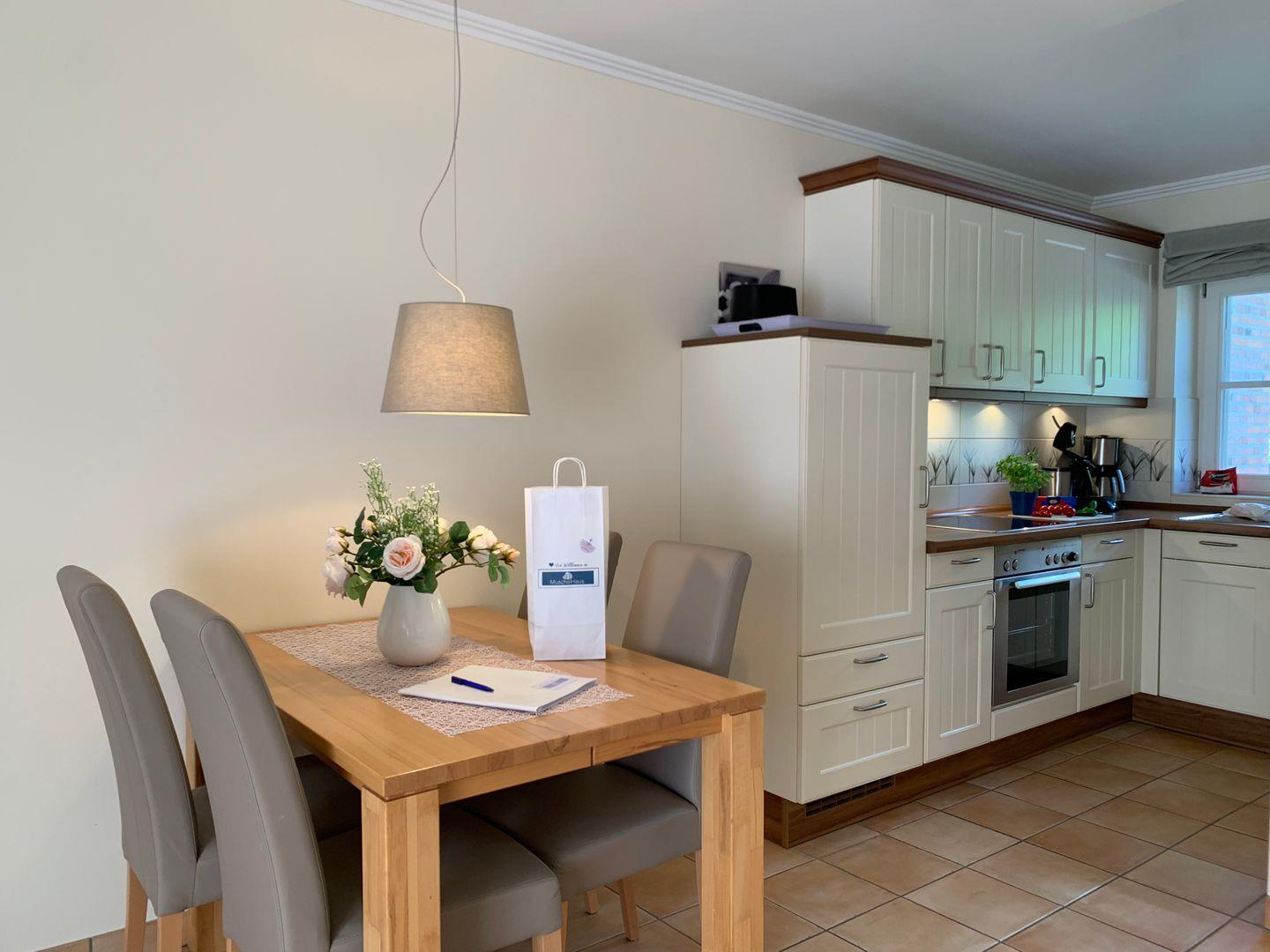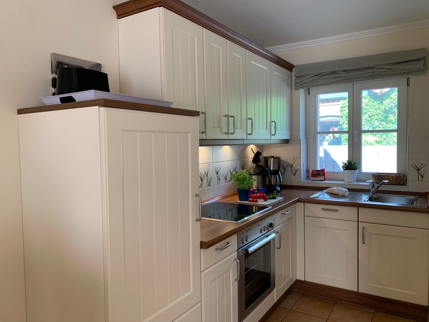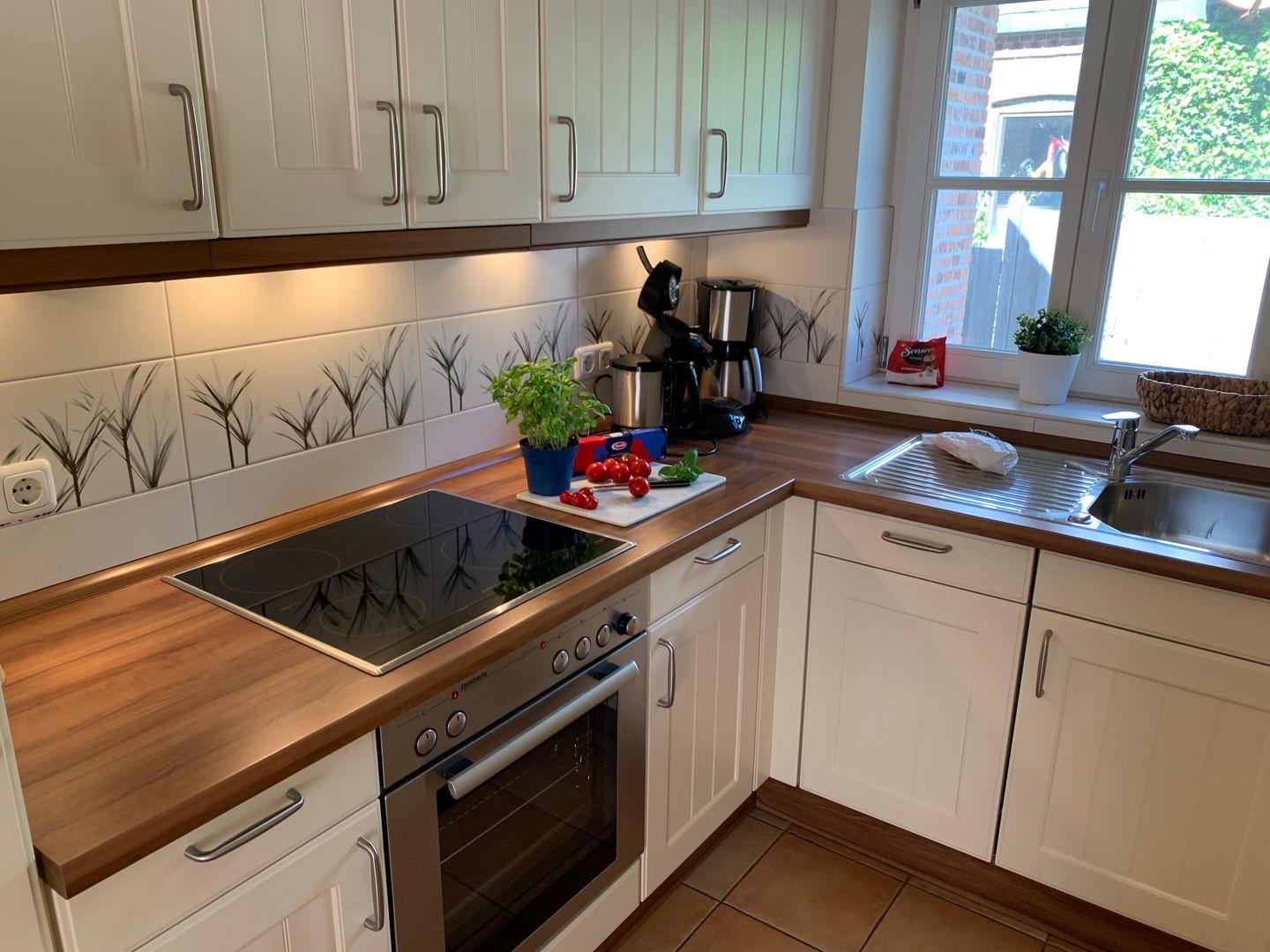 Die integrierte Küche ist modern und umfangreich ausgestattet, unter anderem sind Cerankochfeld und Backofen, Kühlschrank mit Gefrierfach sowie Geschirrspüler und Kaffeemaschine vorhanden.