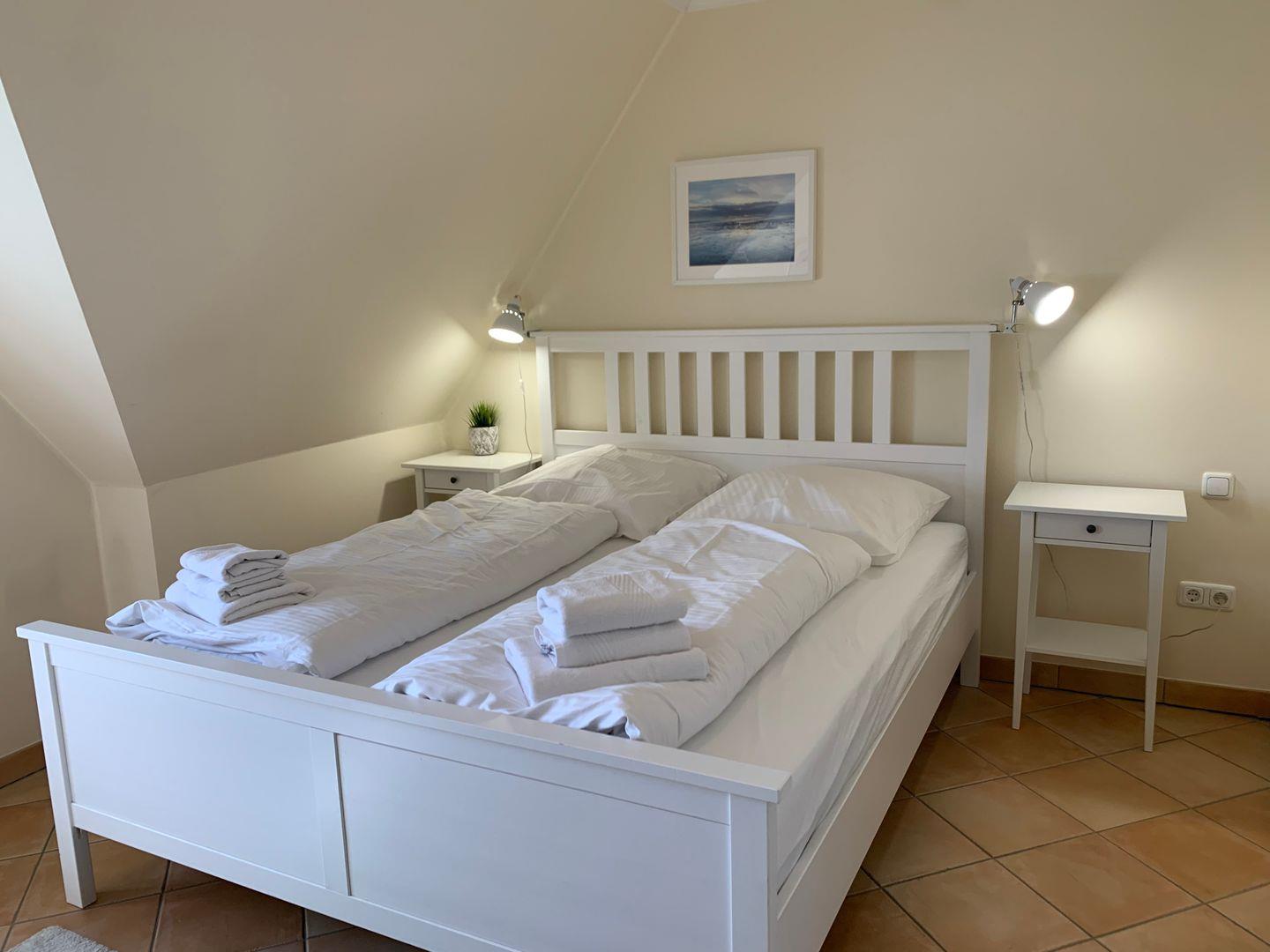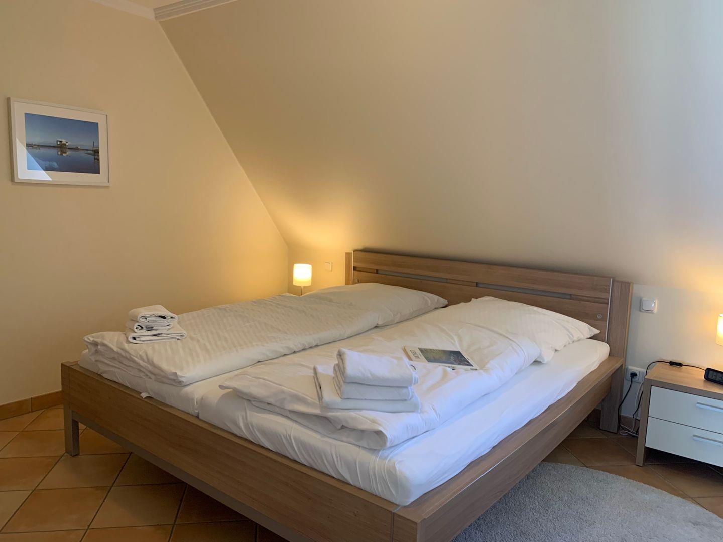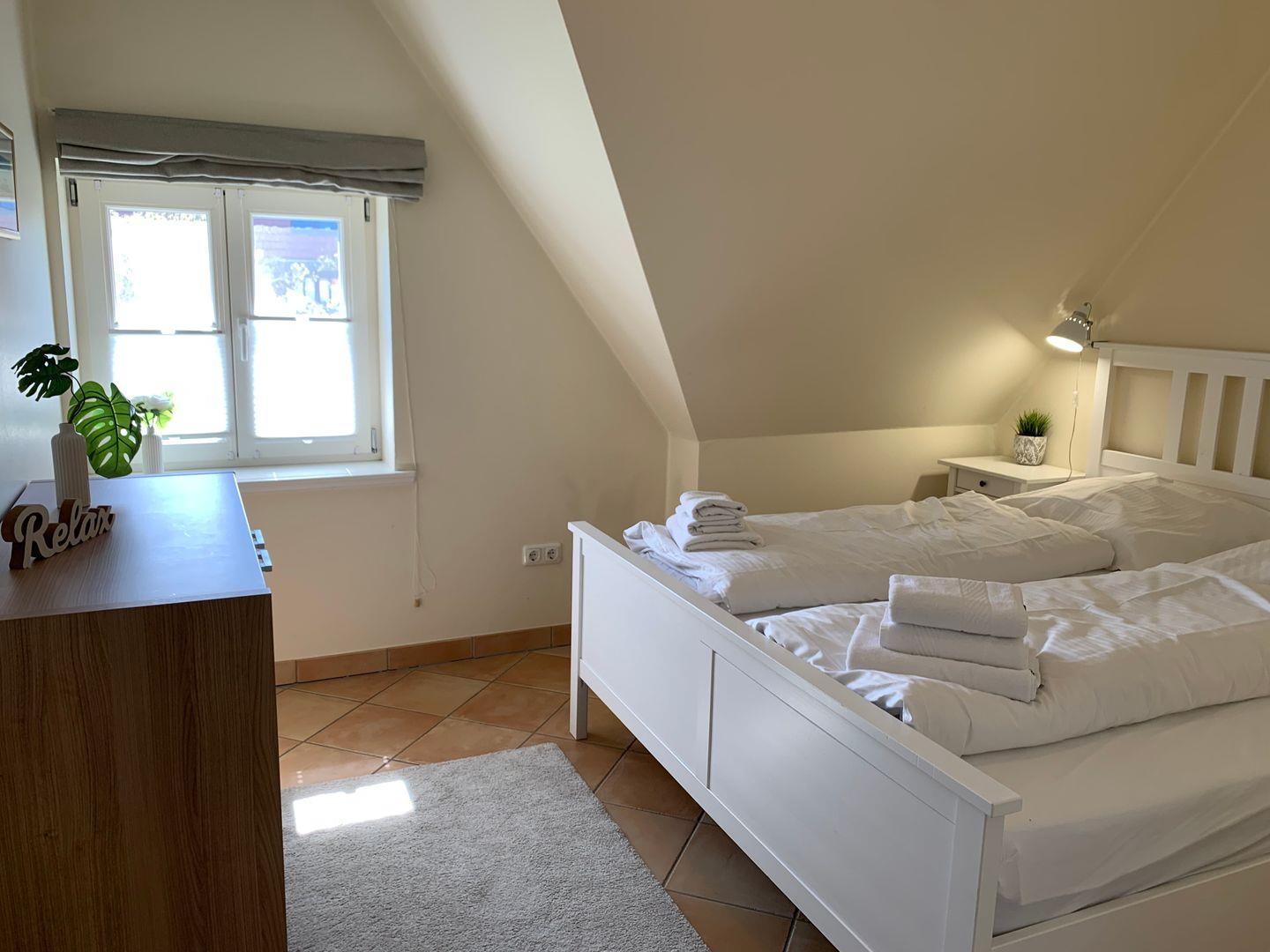 Im Obergeschoss stehen zwei helle, einladende Schlafzimmer zur Verfügung, eines ist ausgestattet mit komfortablem 180x200cm Doppelbett, ein weiteres mit 160x200 Doppelbett.