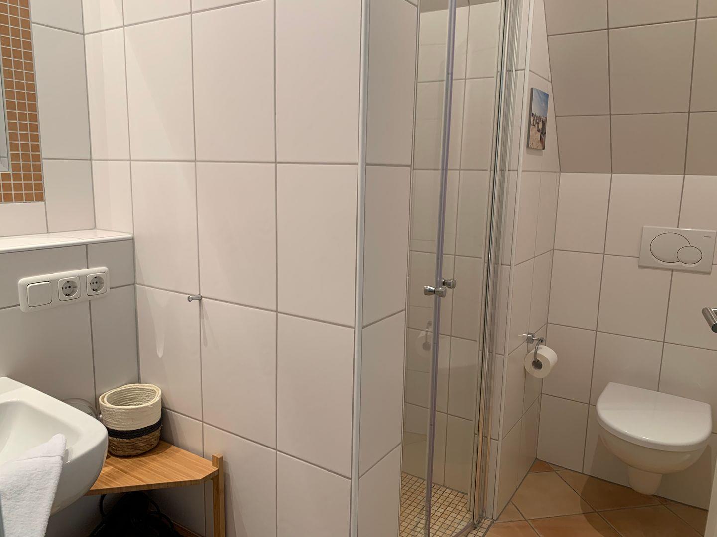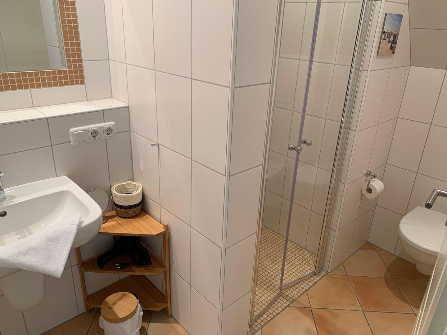 Zum Obergeschoss gehört weiterhin ein Badezimmer mit ebenerdiger Dusche und WC, ein Handtuchtrockner ist vorhanden.