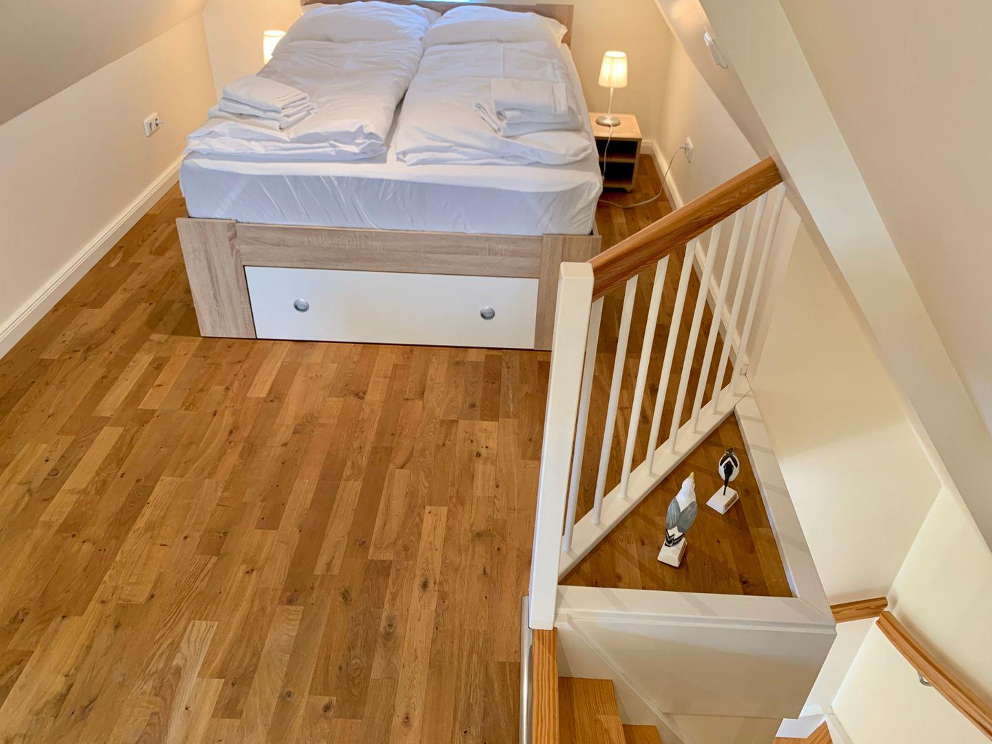 Das Schafzimmer im 1. OG ist ausgestattet mit einem komfortablen 160x190cm Doppelbett. Zur Ferienwohnung gehört ein Badezimmer mit ebenerdiger Dusche und WC, ein Handtuchtrockner ist vorhanden.