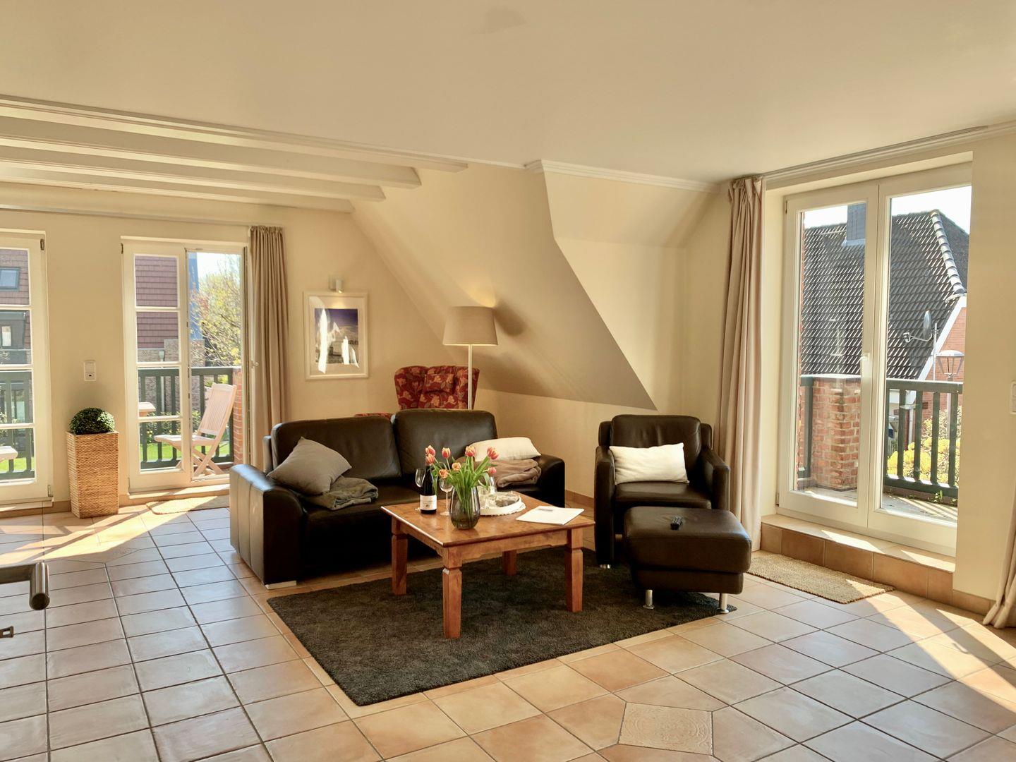 Moderne 3-Zimmer-Ferienwohnung mit zwei Balkonen in St. Peter-Ording, ideal für erholsame Urlaubstage.