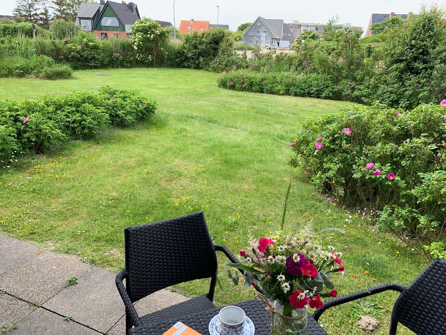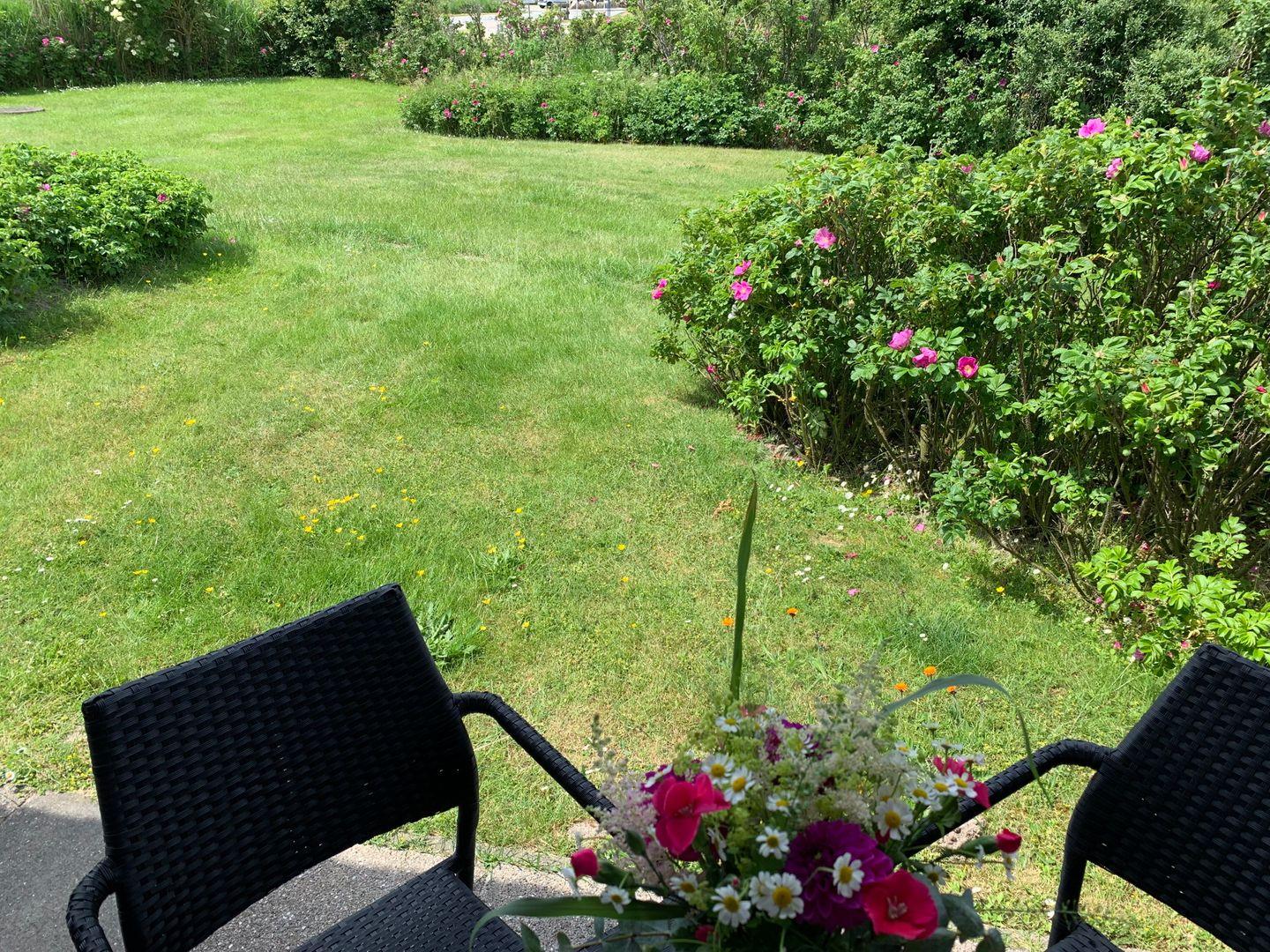 Zur Ferienwohnung gehört eine möblierte Terrasse und die Mitnutzung des Gartens, der sich wunderbar zum Sonnenbaden eignet.