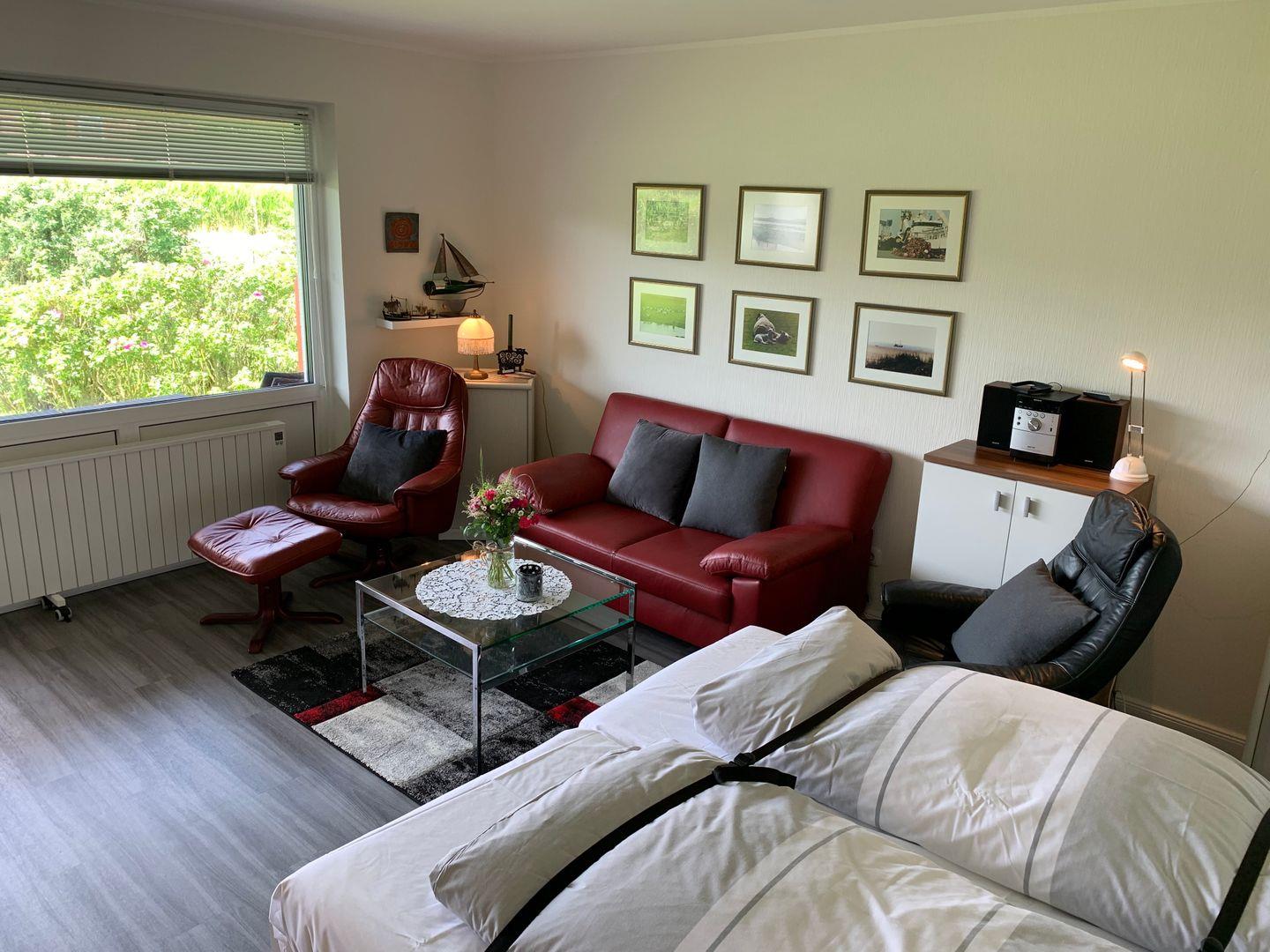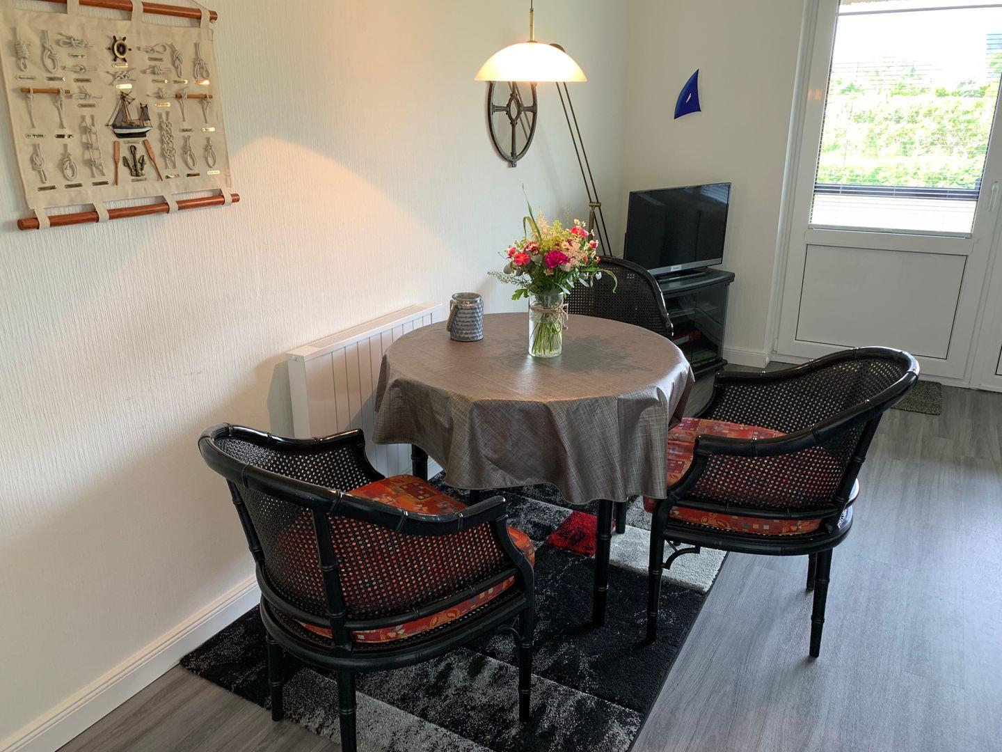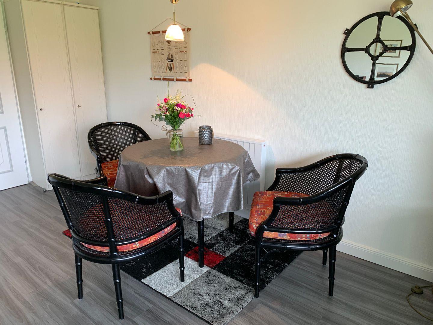 Einladende 1-Zimmer Ferienwohnung mit Terrasse unter Reetdach. Ausgestattet im Wohnraum mit Esstisch, Sofa und Sesseln,