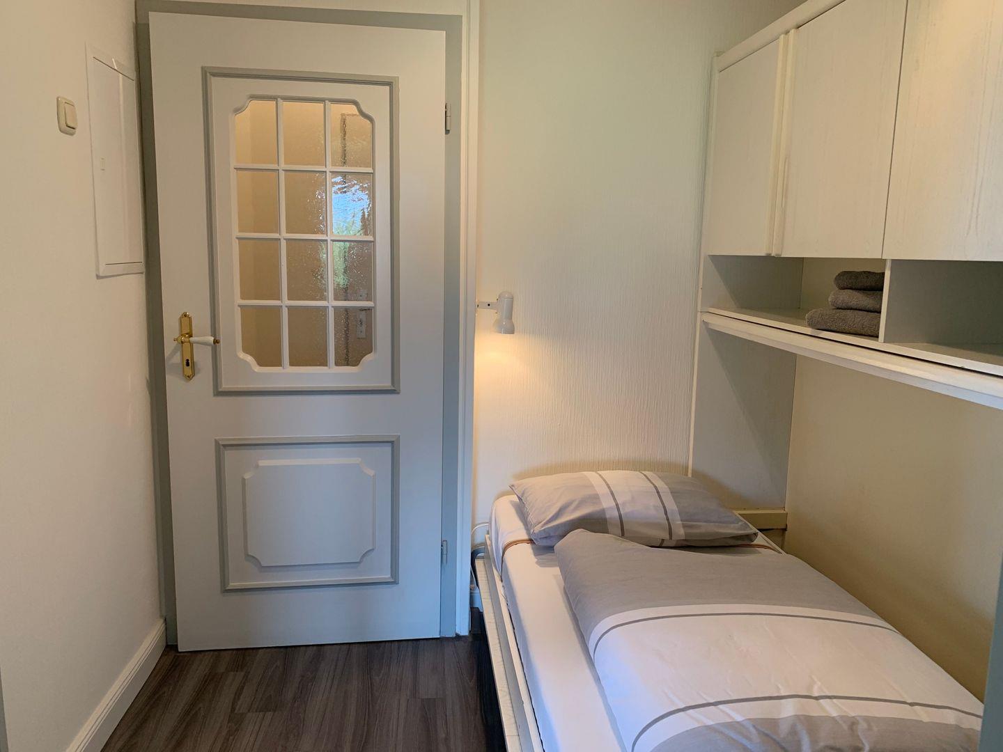 Im Flur steht ein Einzelschrankbett, zur Ferienwohnung gehört ein Duschbad mit WC.