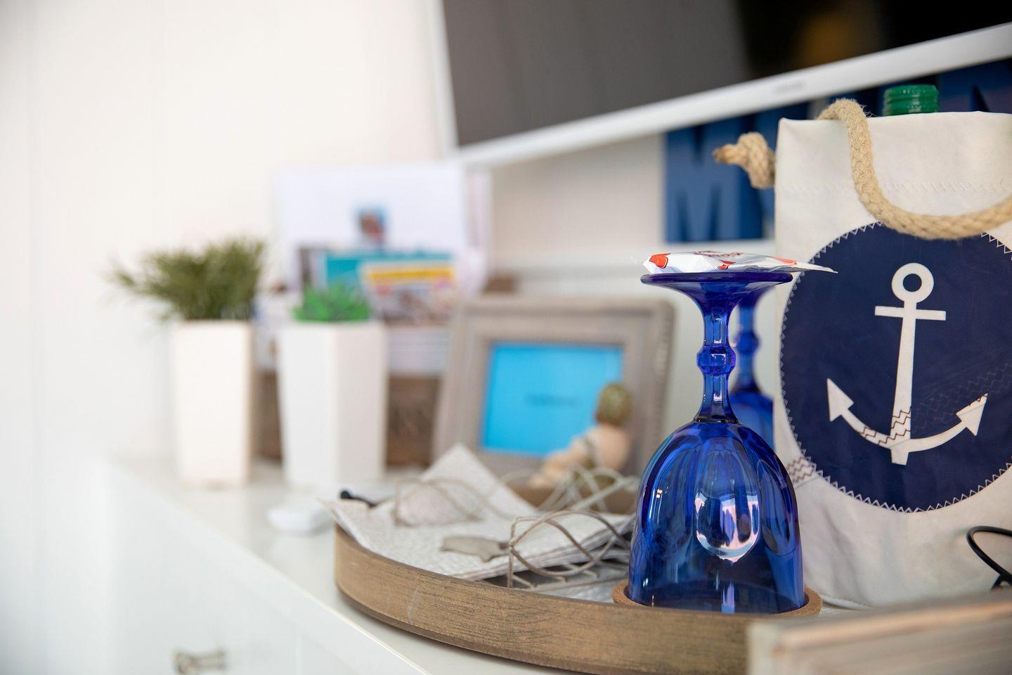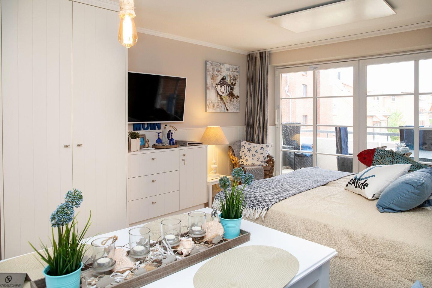 Durch den Übergang zum Balkon und die große Fensterfront wirkt das kombinierte Wohn- und Schlafzimmer wunderbar hell und einladend. Zum maritim und liebevoll eingerichteten Raum gehört ein sehr komfortables 180x200cm Boxspringbett. Von dort schweift der Blick auf den großen Flachbild-TV. Kostenfreies W-LAN ist vorhanden und rundet das Unterhaltungsprogramm der zentral gelegenen Ferienwohnung in St. Peter Ording ab.