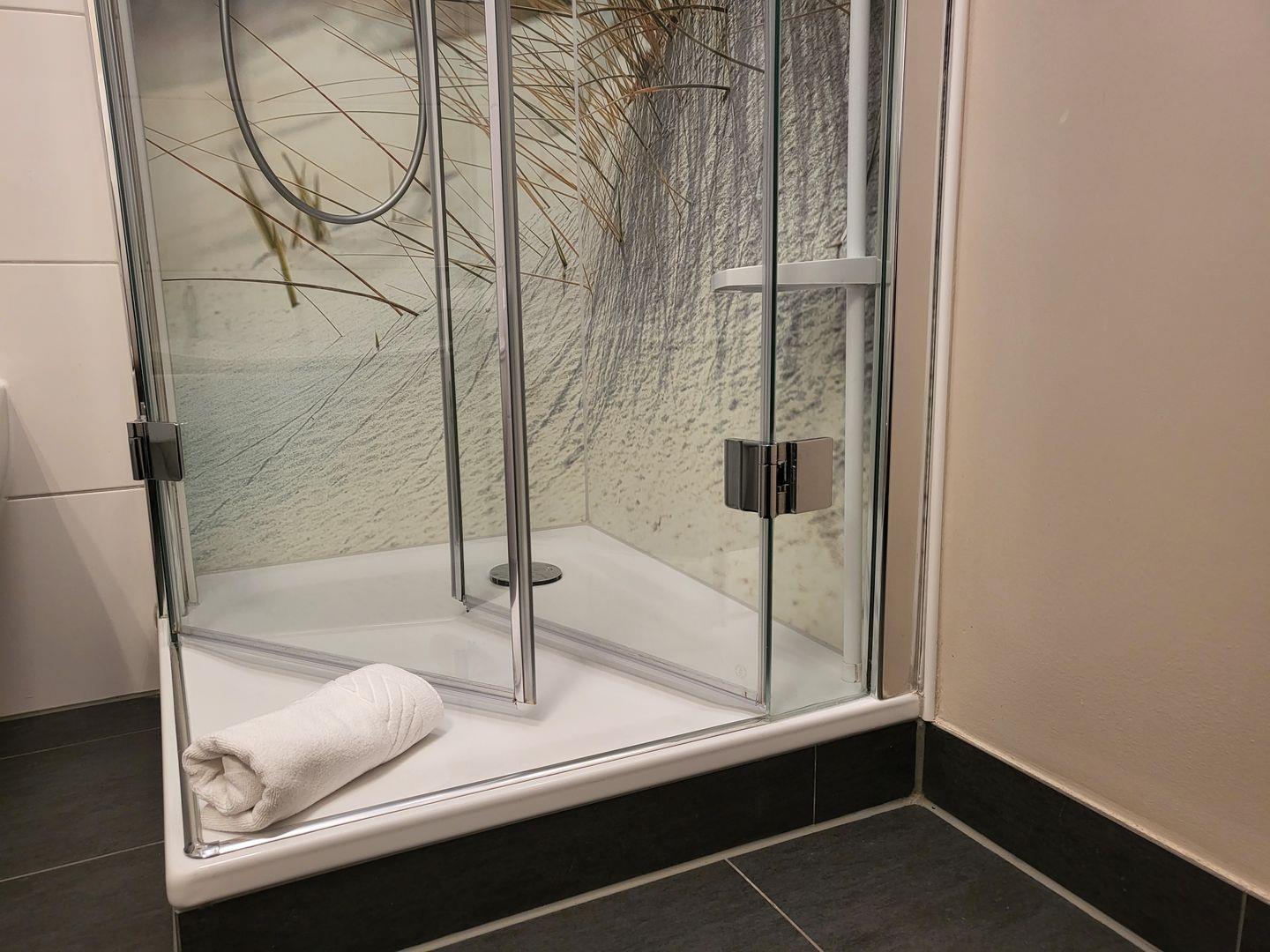 Das separate, maritim eingerichtete Schlafzimmer ist mit 2 Einzelbetten ausgestattet. Zur Ferienwohnung gehört ein modernes Duschbad mit WC.