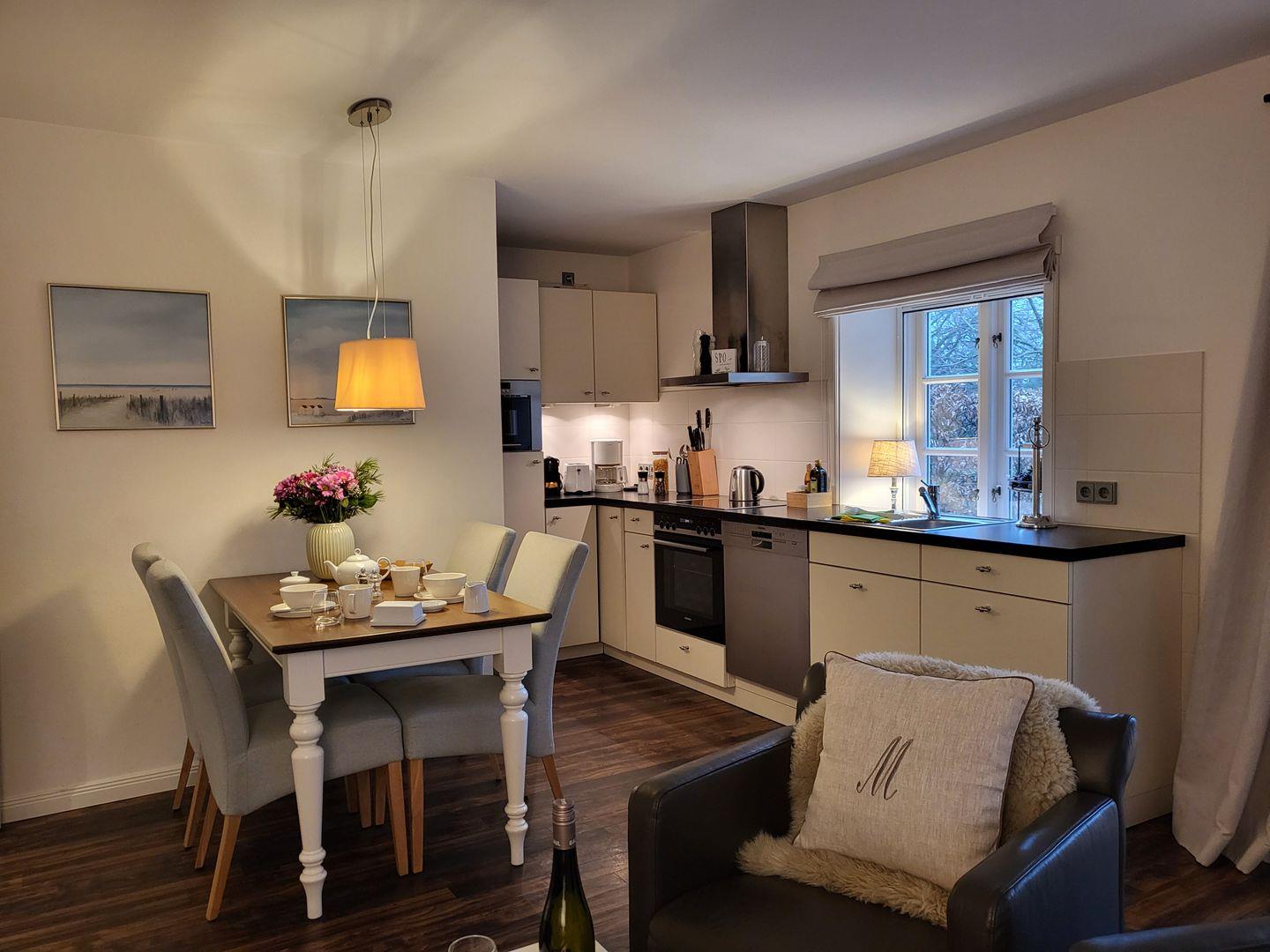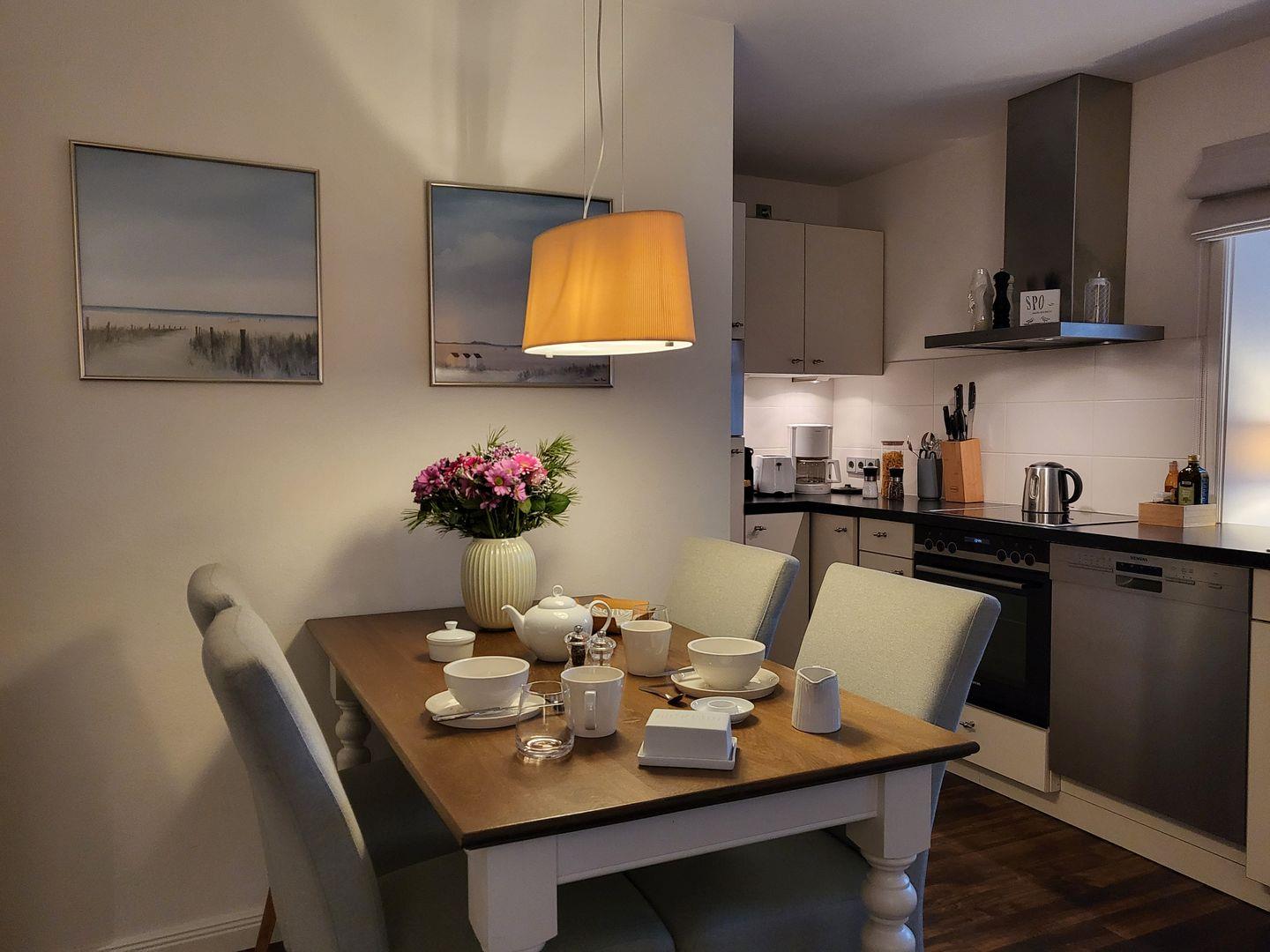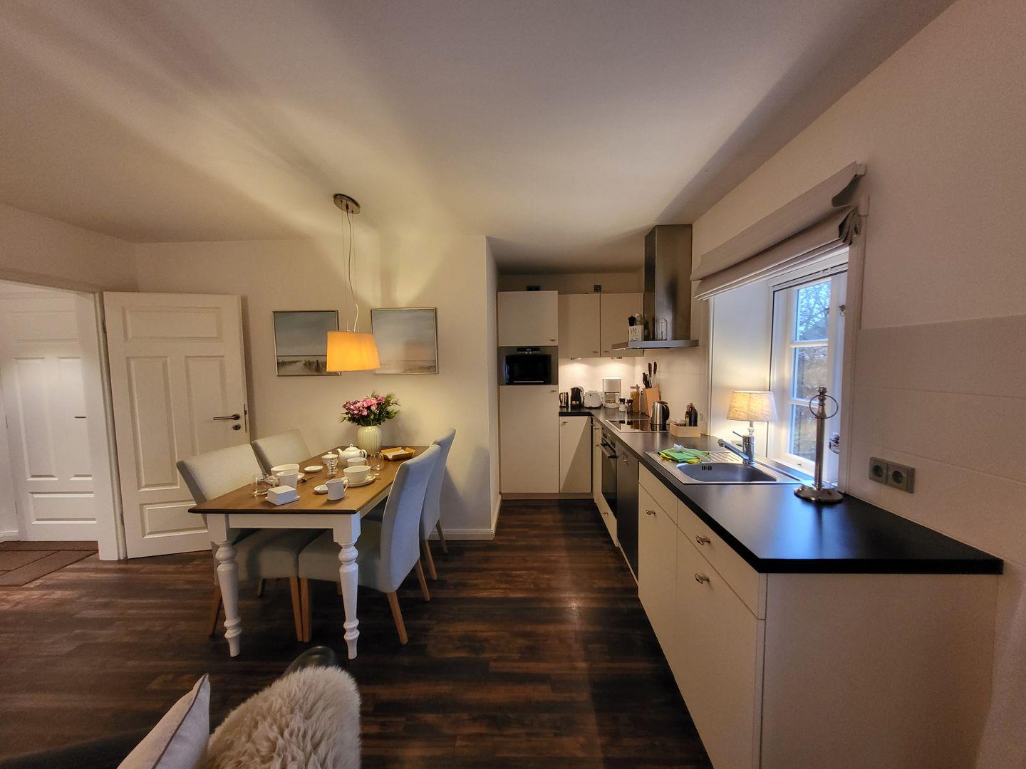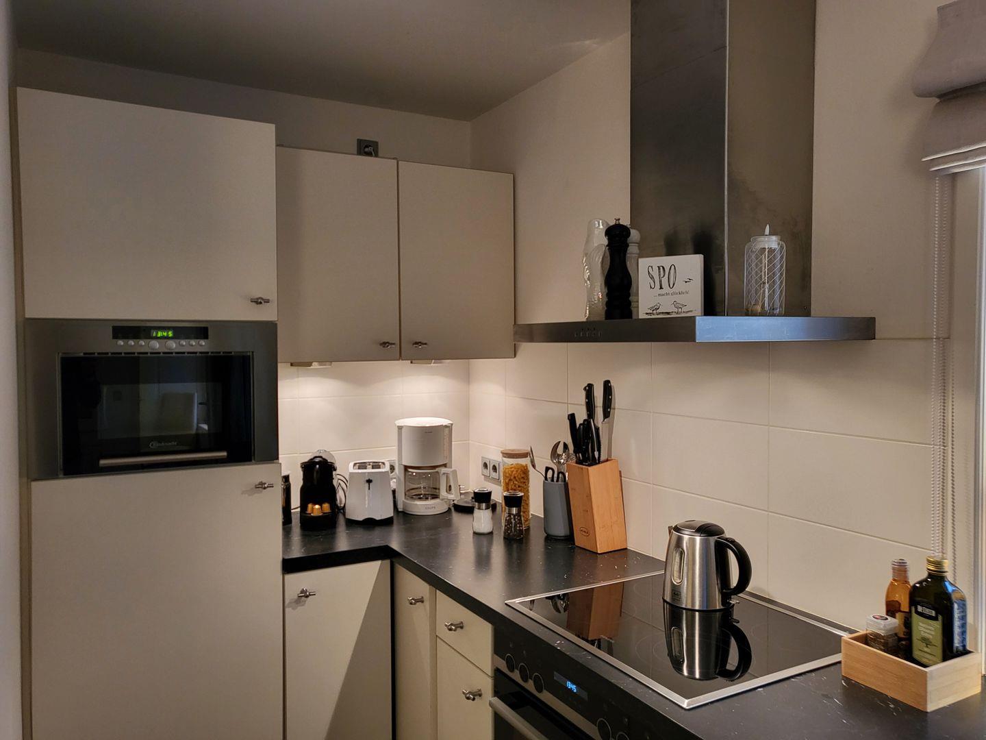 Dort gehören unter anderem Cerankochfeld und Backofen, ein Kühlschrank mit Gefrierfach, ein Geschirrspüler sowie Mikrowelle und zwei Kaffeemaschinen zur Ausstattung – eine für klassischen Filterkaffee, eine weitere für Kaffee-Pads.