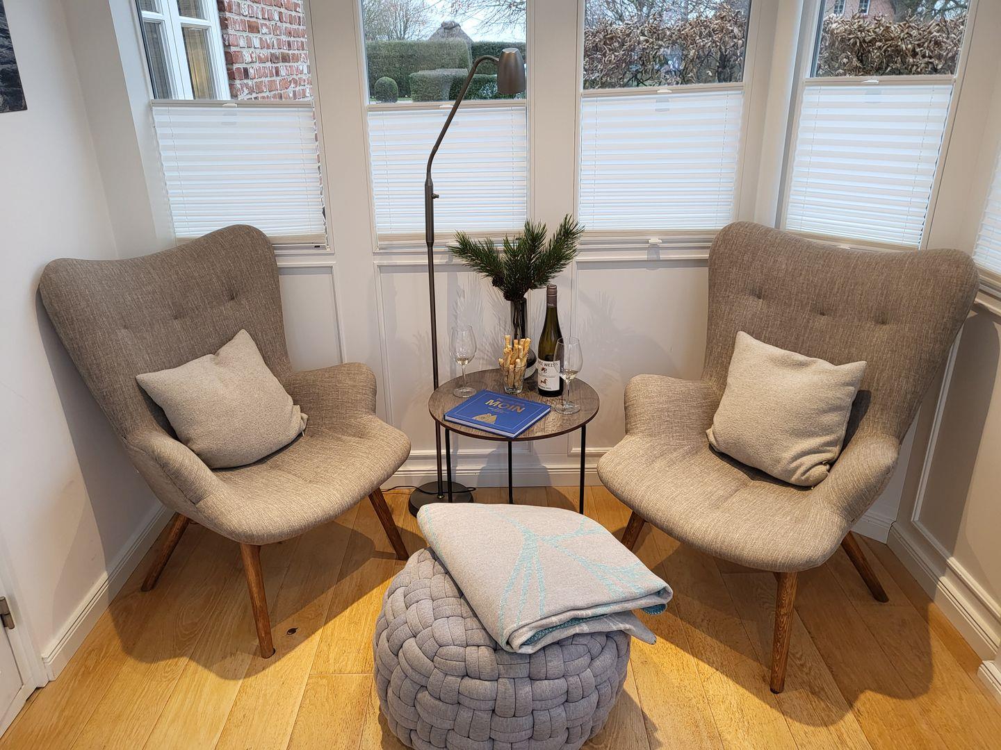 Zur Ausstattung gehört hier eine sehr komfortable Sitzgarnitur, bestehend aus einer Sofagarnitur aus Leder und zwei Ledersesseln.
