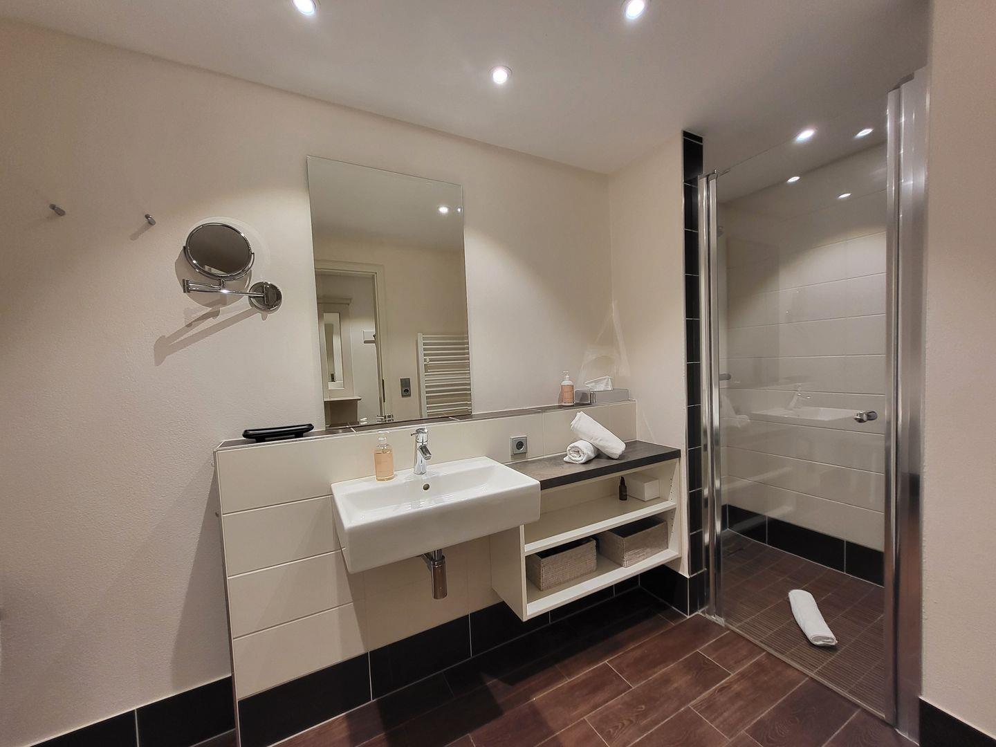 Das geräumige Luxusduschbad beeindruckt mit bodengleicher Dusche und elektrischem Handtuchtrockner, auch ein Haartrocknerist hier vorhanden.