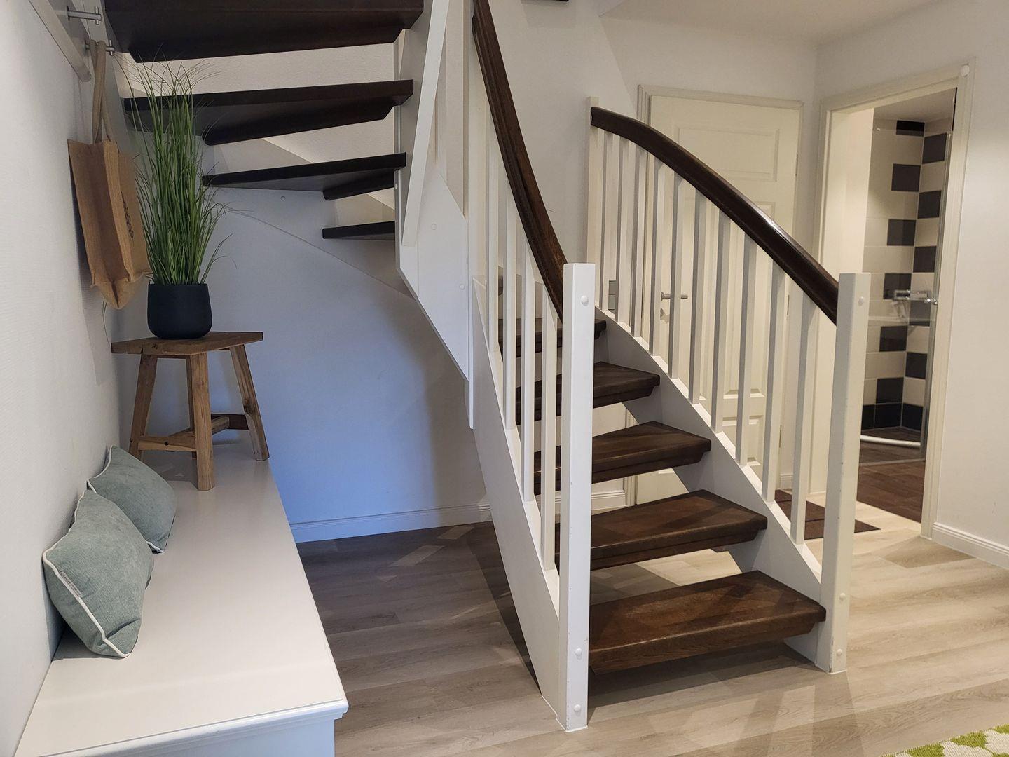 Die sehr moderne 3-Zimmer Ferienwohnung befindet sich im Obergeschoss und bietet auf 63m² Platz für bis zu 4 Personen und Kleinkind.