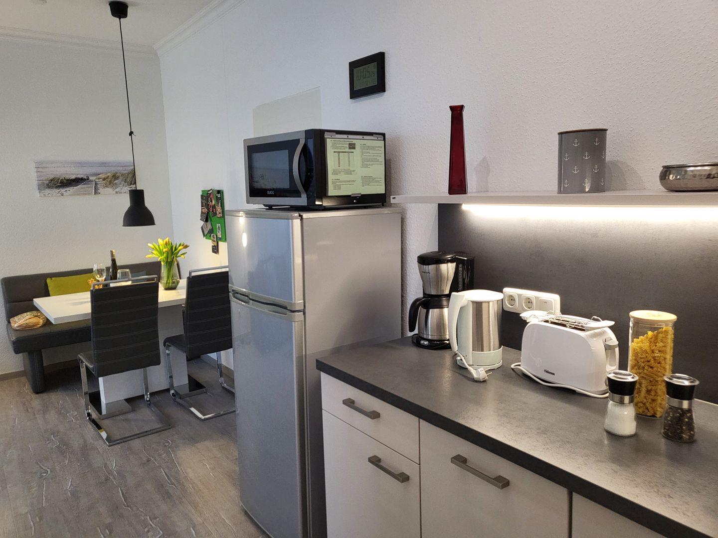 Die angrenzende, offene Küche ist hochwertig und vollumfassend eingerichtet und ausgestattet. Hier stehen unter anderem Cerankochfeld, ein großer Kühlschrank mit Gefrierfach, ein Geschirrspüler sowie Mikrowelle und Kaffeemaschine zur Verfügung. Das separate Schlafzimmer des Penthouses ist ausgestattet mit einem komfortablen 160x200cm Doppelbett und verfügt über einen eigenen Flachbild-TV. Zur Ferienwohnung gehören weiterhin Duschbad und WC im anspruchsvollen Badezimmer, das mit einem Handtuchtrockner ausgestattet ist. Diese Wohnung kann den Fahrstuhl nutzen.