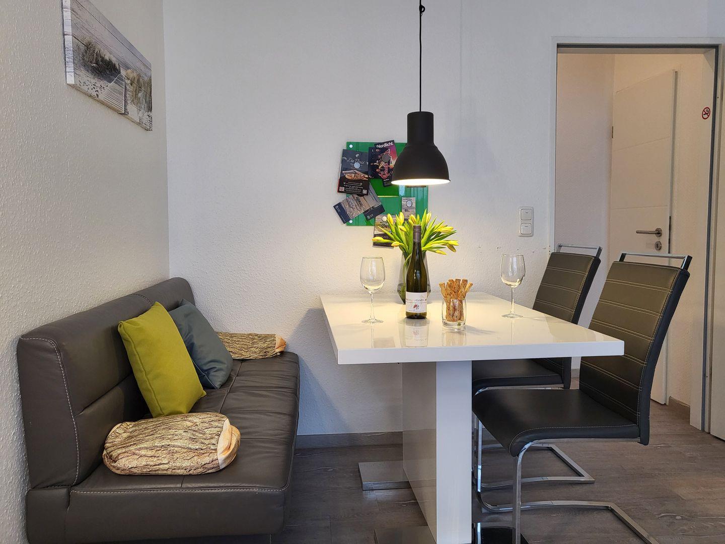 Hier steht in der Sommersaison ein typisch norddeutscher Strandkorb zur Verfügung. Der große Wohnraum ist wunderbar hell und einladend in Szene gesetzt. Zur Ausstattung gehören neben dem sehr bequemen Ledersofa, dass sich als Schlafsofa nutzen lässt, ein hochwertiger Flachbild-TV, eine BOSE Heimkinoanlage sowie eine gemütliche Ess-Ecke. Kostenfreies W-LAN steht zur Verfügung.