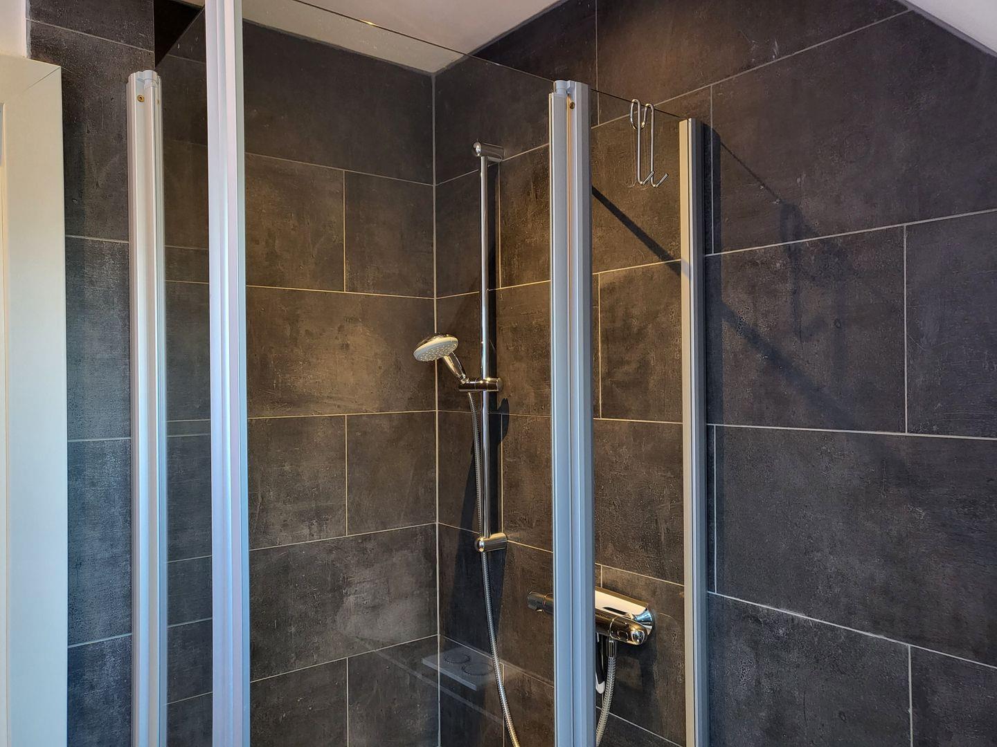 Zur Ferienwohnung gehört ein modern gestaltetes Badezimmer mit Veluxfenster, Dusche, Waschbecken und WC.