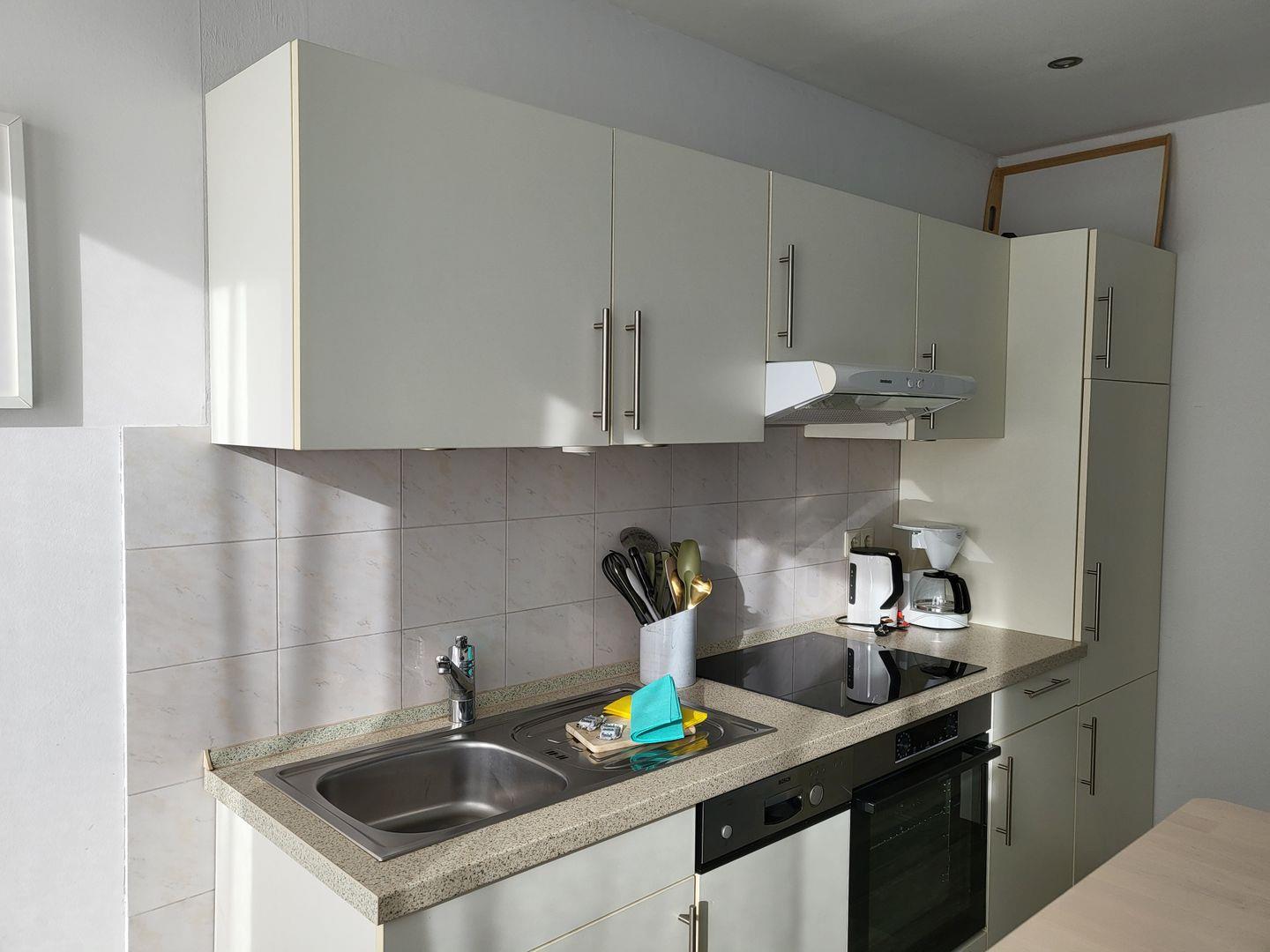 Das Wohnzimmer ist ausgestattet mit einem hochwertigen Schlafsofa und gemütlichen Sitzgelegenheiten. Für gemütliche Abende und Unterhaltung sorgen ein großer Flachbild-TV und kostenfreies W-LAN. Helle Farben, moderne Einrichtung und Panoramafenster sorgen für eine wohnliche Atmosphäre im Wohnraum. Die separate Küche ist sehr gut ausgestattet und bietet neben einem Induktionskochfeld und Backofen noch Kühlschrank mit Gefrierfach sowie Geschirrspüler und eine Kaffeemaschine. Ein kleiner Esstisch steht zur Verfügung.