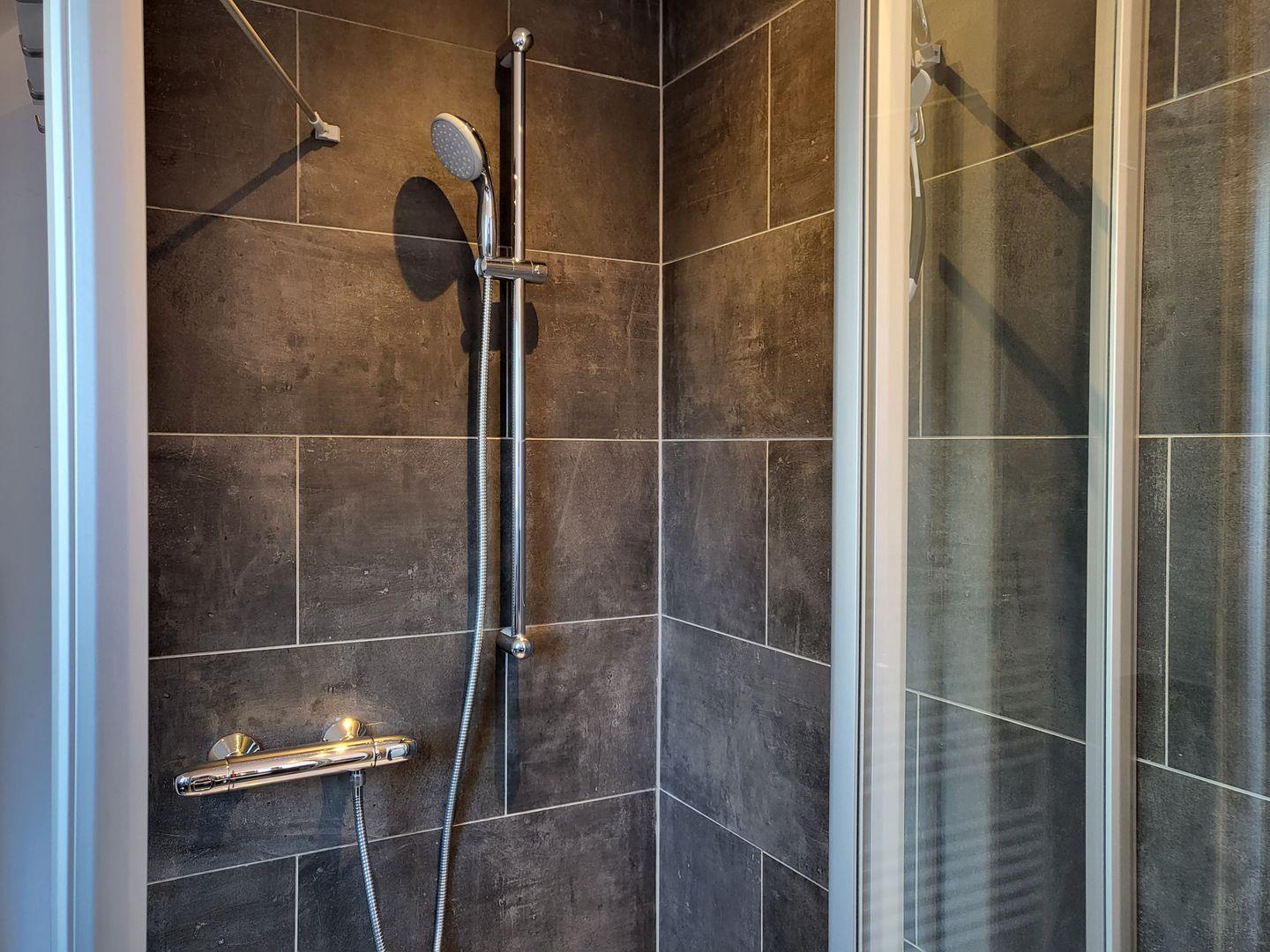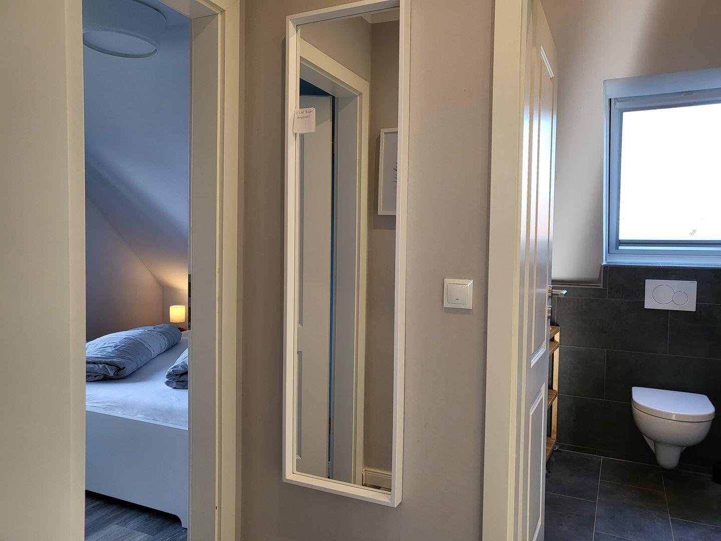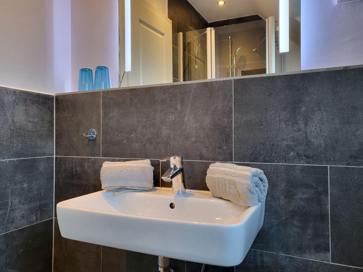 Zur Ferienwohnung gehört ein modern gestaltetes Badezimmer Veluxfenster, Dusche, Waschbecken und WC.
