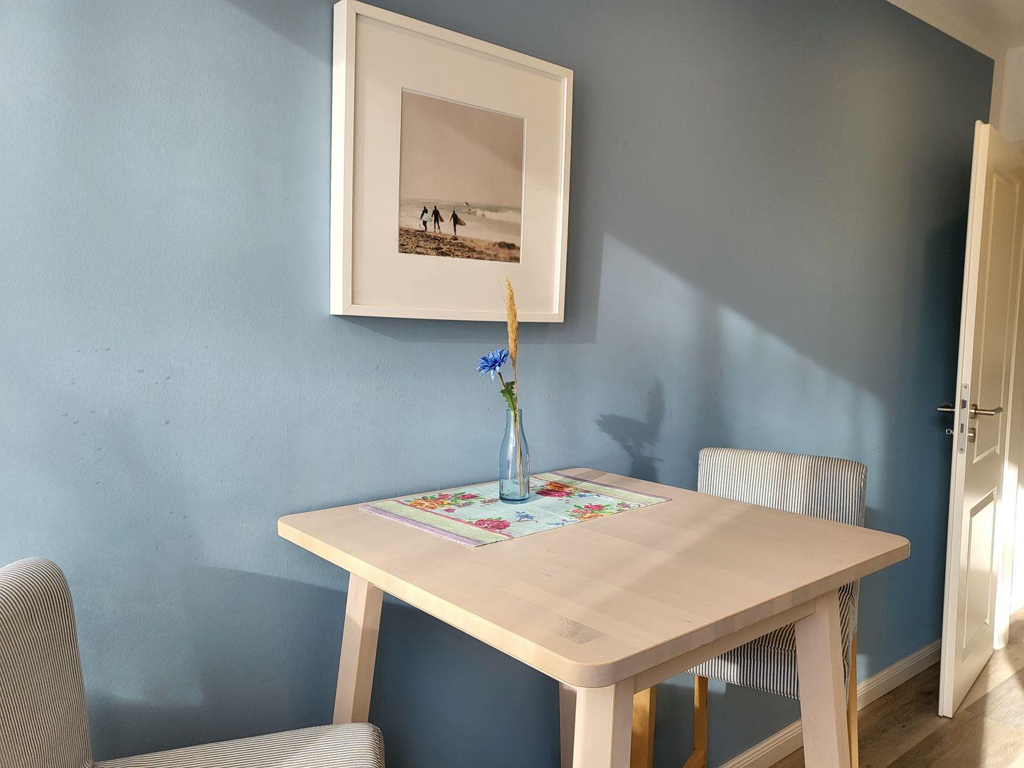 Heller Wohnraum mit Esstisch und Schlafcouch,ein separates Schlafzimmer mit Doppelbett sowie separate Küche.