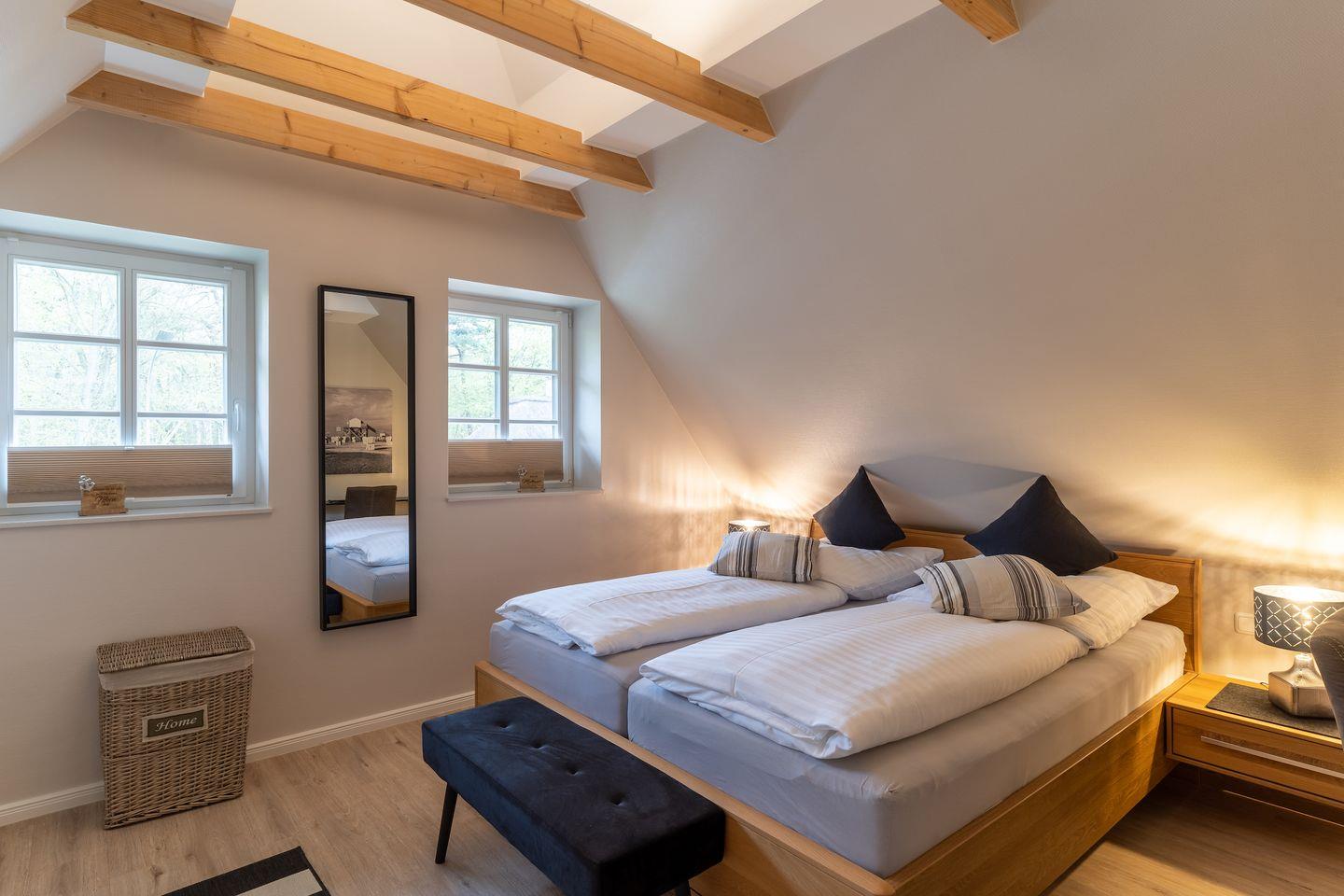 Über eine Holztreppe im Flur gelangt man in das Obergeschoss mit zwei Schlafzimmern. Ein Schlafzimmer ist mit einem Doppelbett ausgestattet und bietet jeden Komfort. Darüber hinaus befindet sich im Obergeschoss ein weiteres Schlafzimmer mit zwei Einzelbetten und einem TV. Außerdem ist im Obergeschoss ein weiteres Duschbad.