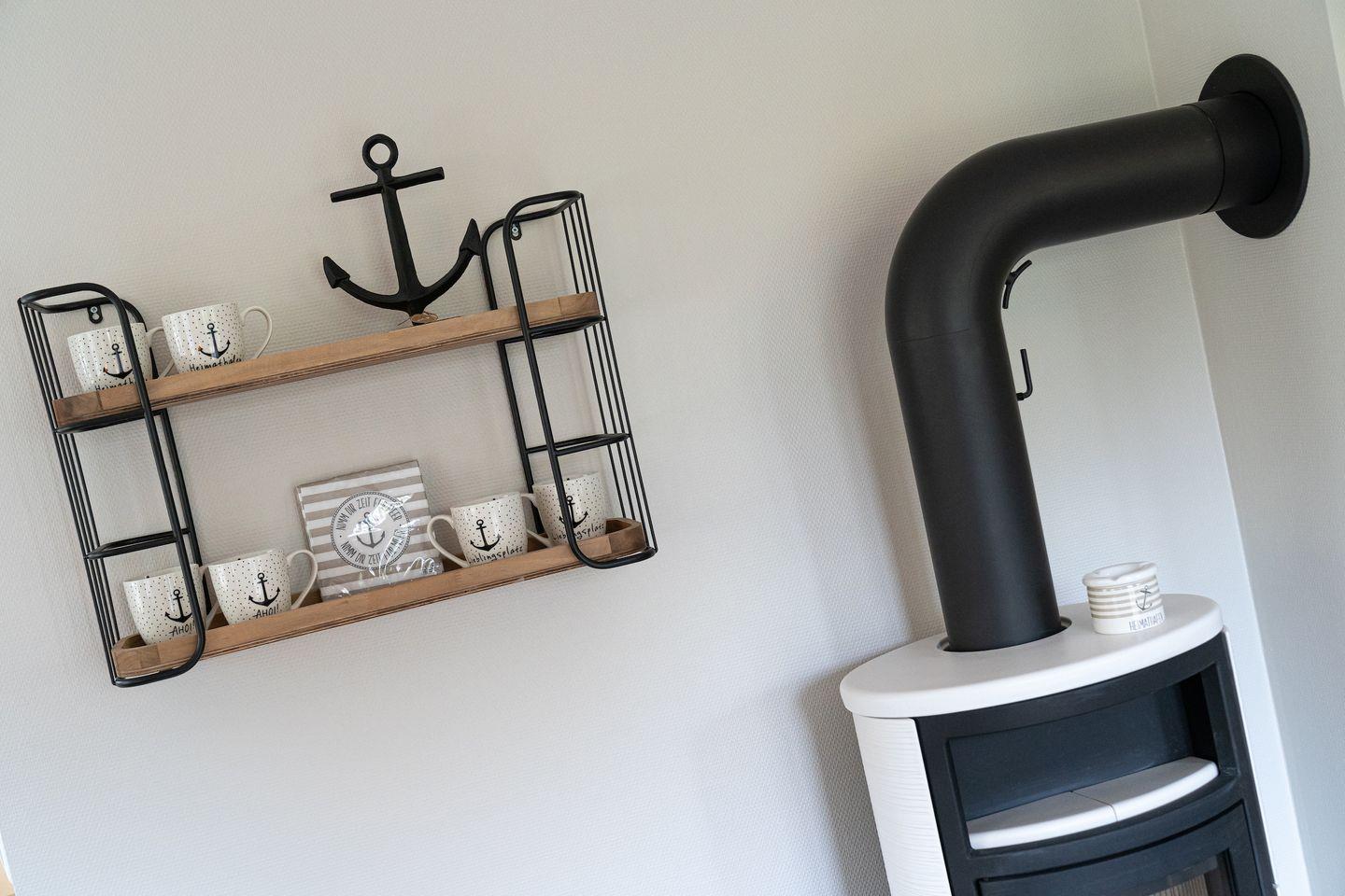 Im Erdgeschoss befindet sich ein lichtdurchflutetes Wohnzimmer mit einem Kamin, einer offenen Küche sowie einem Essbereich. Die Küche verfügt über hochwertige Elektrogeräte und bietet genügend Platz zum gemeinsamen Kochen. Im Erdgeschoss ist ebenso ein großer Flur, ein Duschbad und ein Doppelschlafzimmer mit Zugang auf die Terrasse.