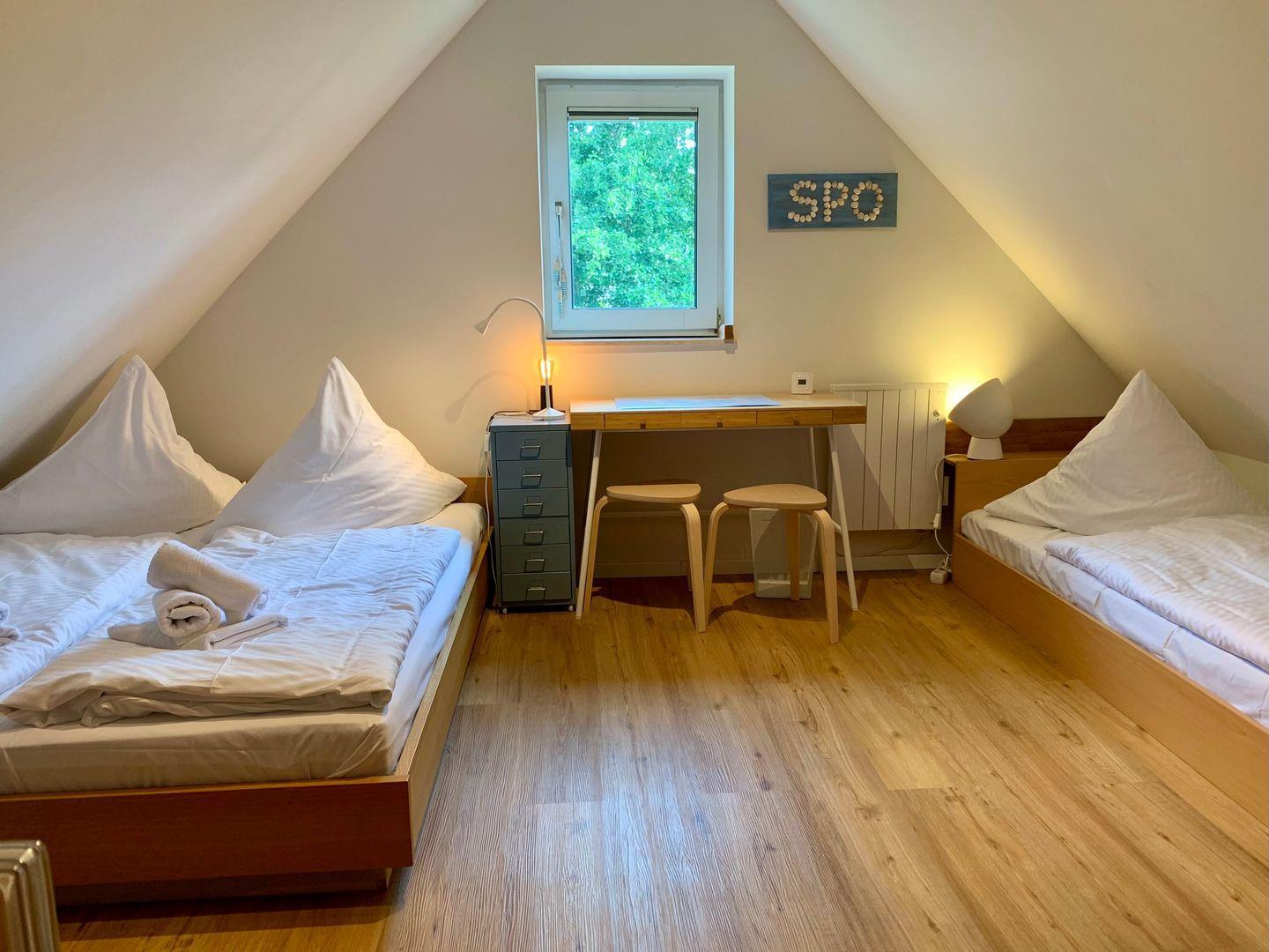 Das große Schlafzimmer im Dachgeschoss ist ausgestattet mit 160x200cm Doppelbett sowie einem Einzelbett.