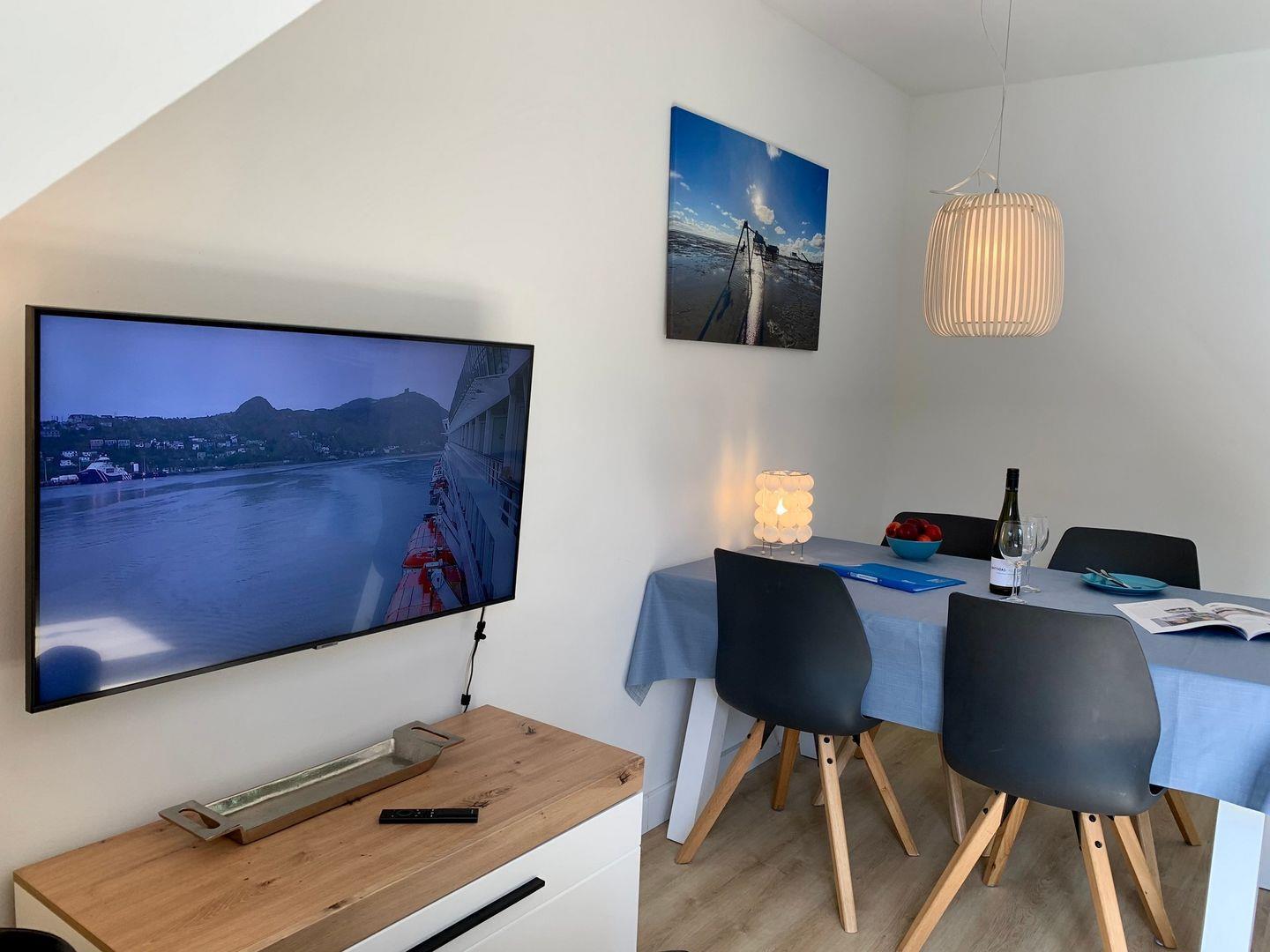 Am Esstisch ist Platz für die gesamte Familie, für die Unterhaltung im Urlaub sorgt ein großer 43“ Smart-TV sowie kostenfreies W-LAN.