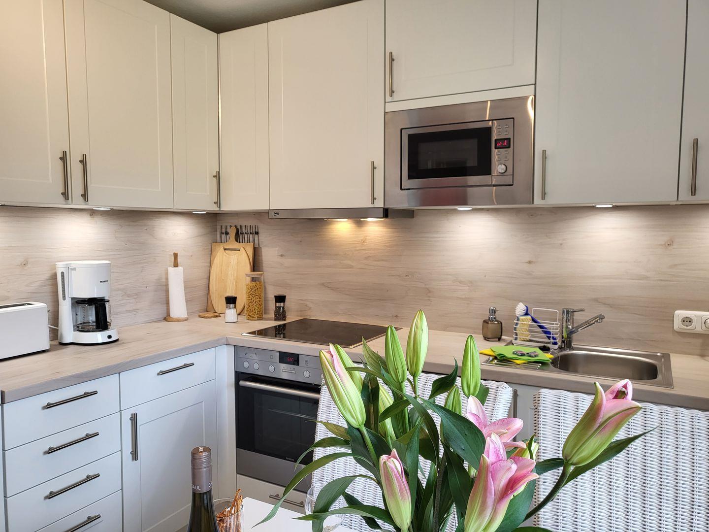 Die separate Küche ist sehr gut ausgestattet, unter anderem stehen hier Cerankochfeld und Backofen sowie Kühlschrank mit Gefrierfach und Geschirrspüler zur Verfügung. Zum Erdgeschoss gehört weiterhin ein helles Tageslichtbadezimmer, das mit Dusche, Waschbecken und WC ausgestattet ist.