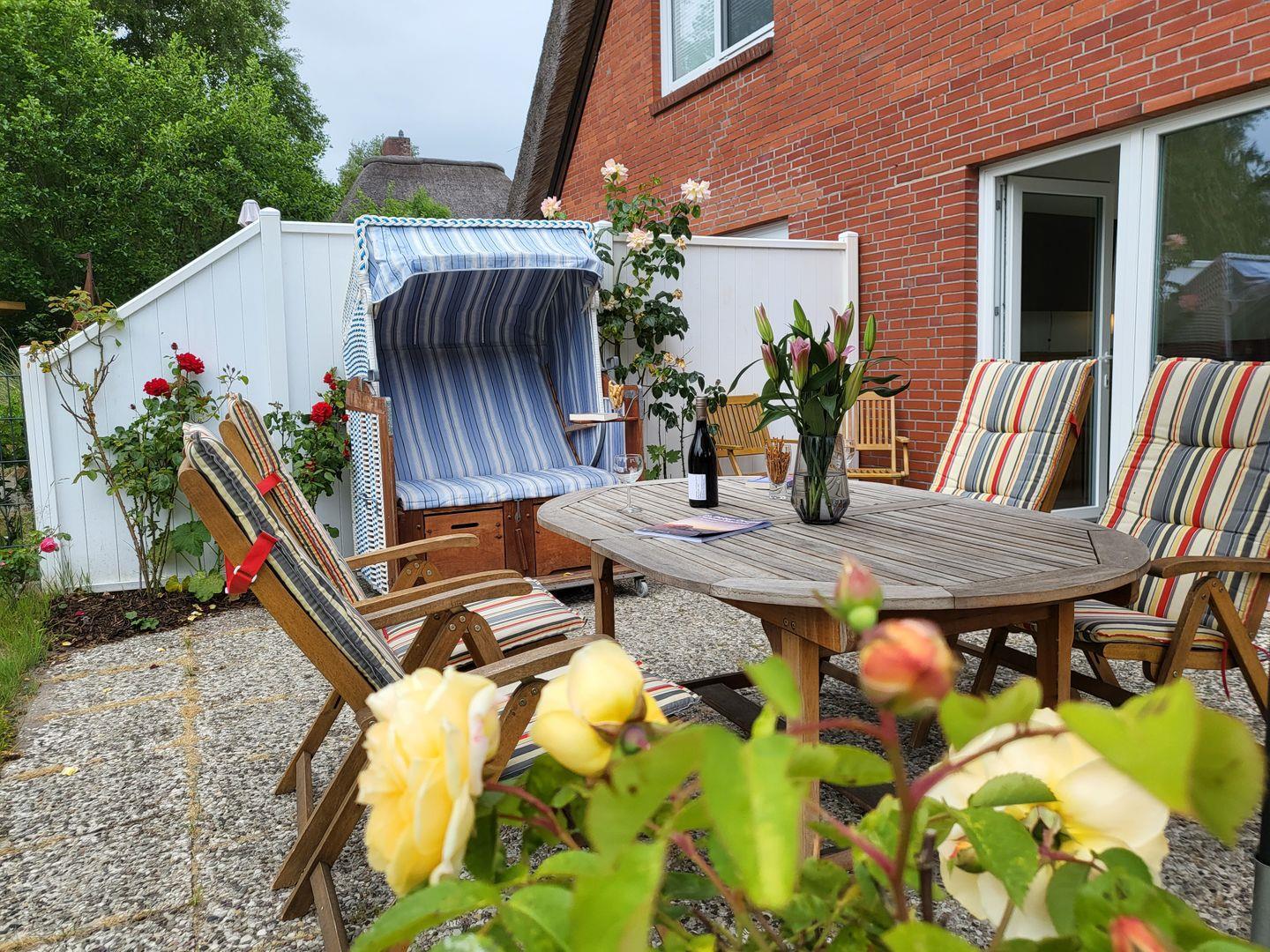 Gemütliches Ferienhaus unter Reetdach in St. Peter-Ording mit Terrasse, Garten und moderner Ausstattung für erholsame Urlaubstage.