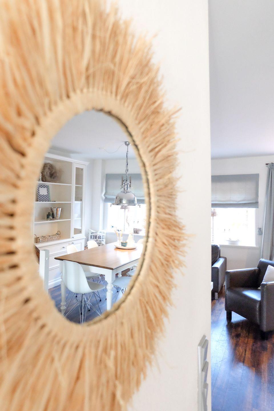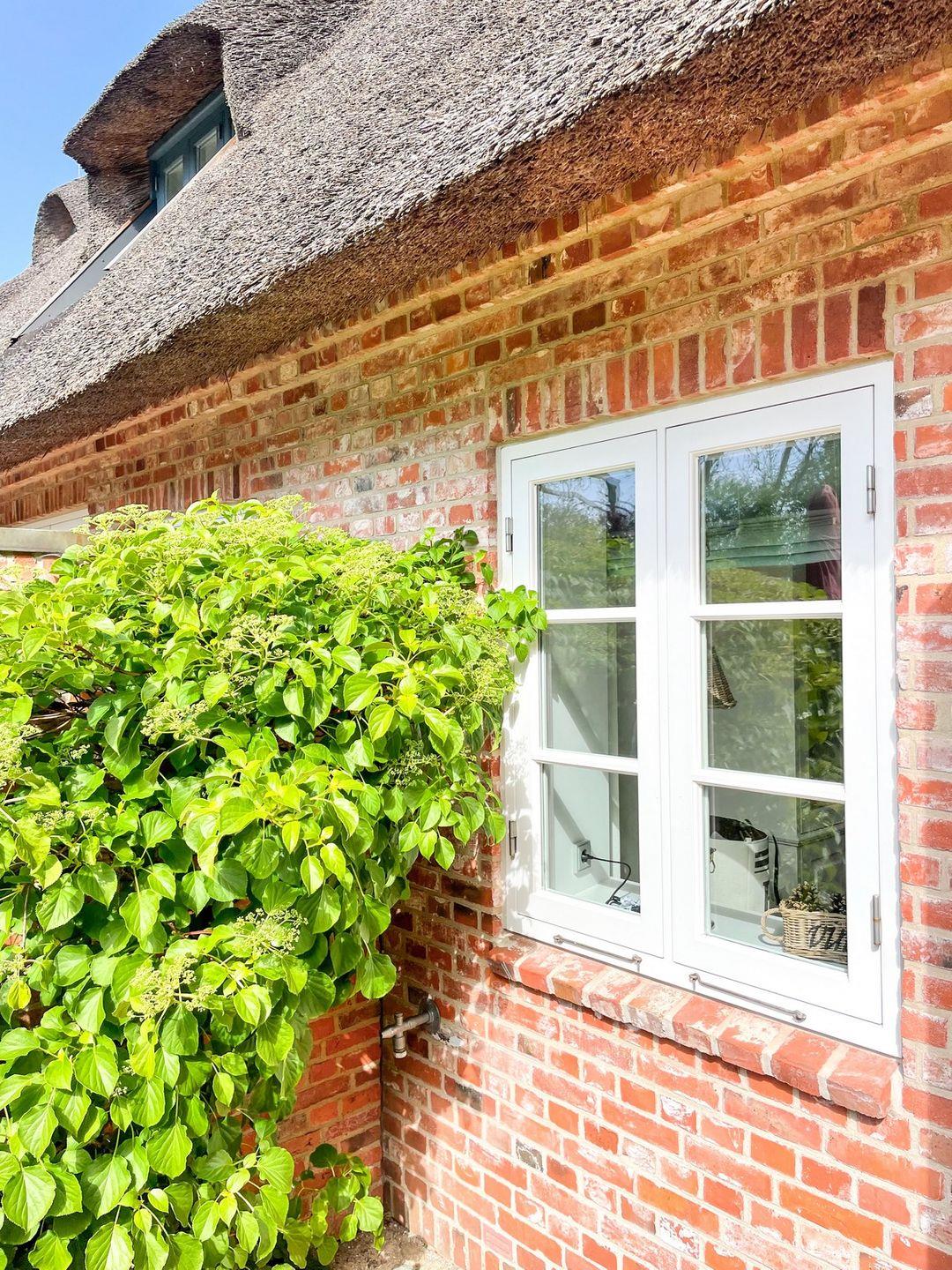 Durch den Übergang zur Terrasse wirkt der modern und lebendig gestaltete Wohnraum wunderbar hell und einladend. Durch die Holzsprossenfenster bietet sich ein toller Ausblick auf den Garten und das Reetdach.