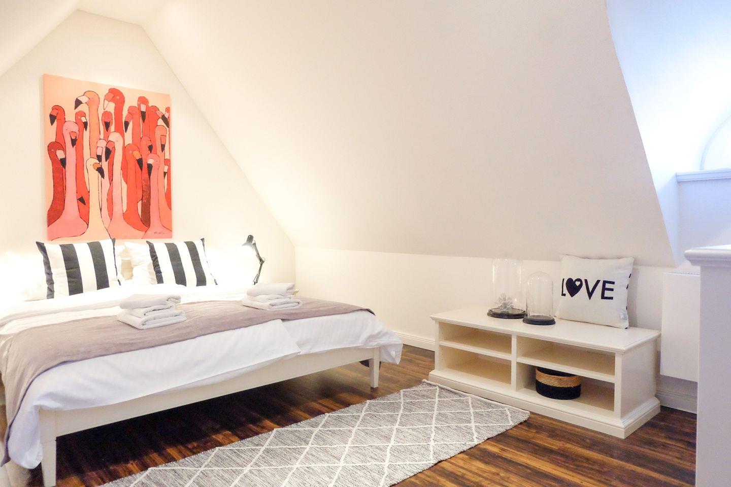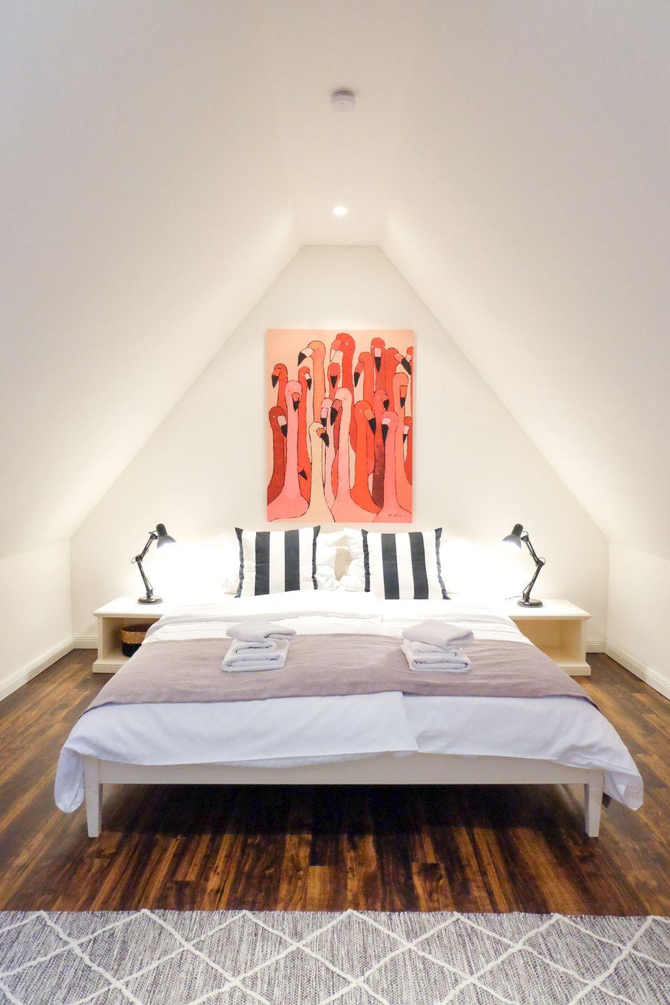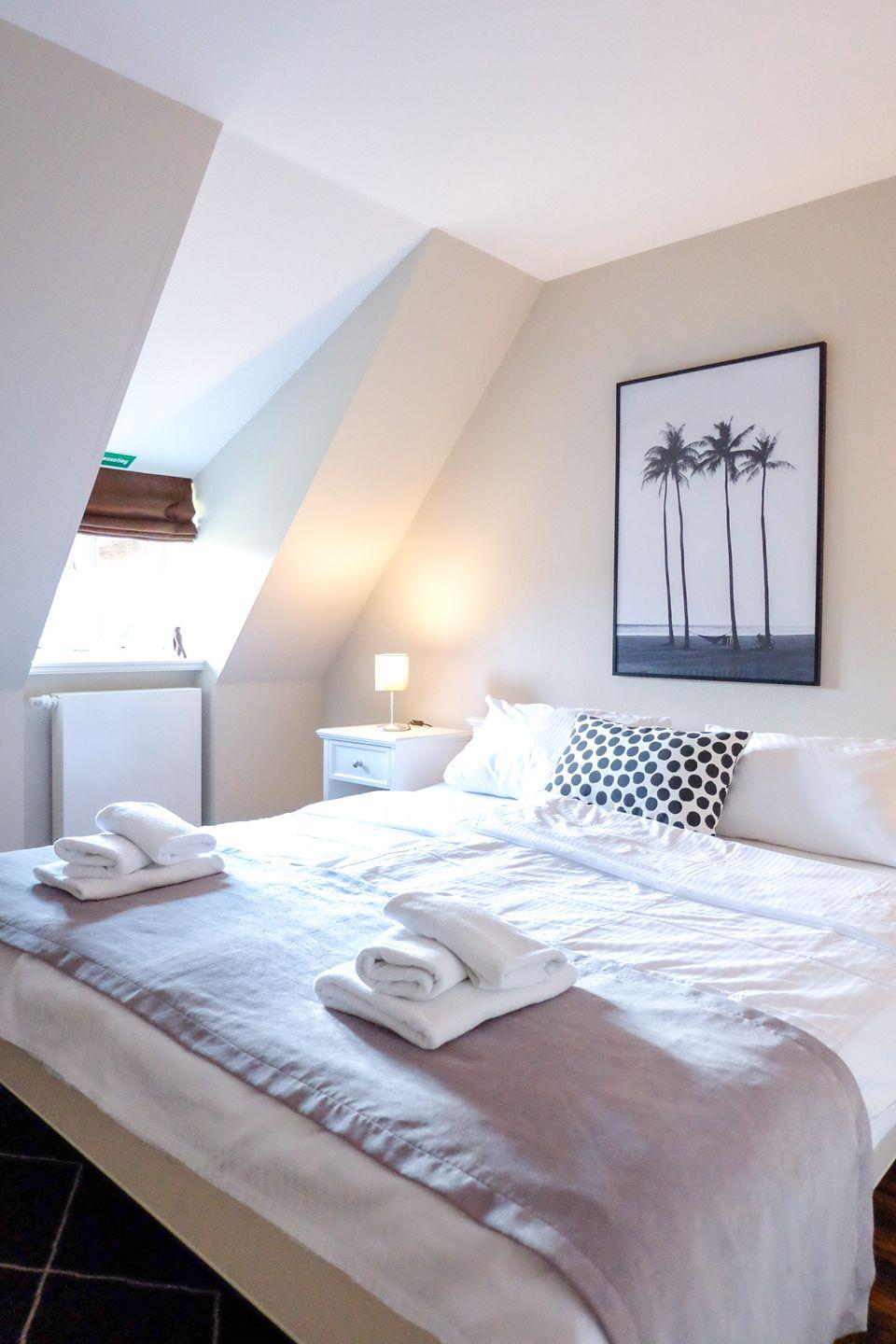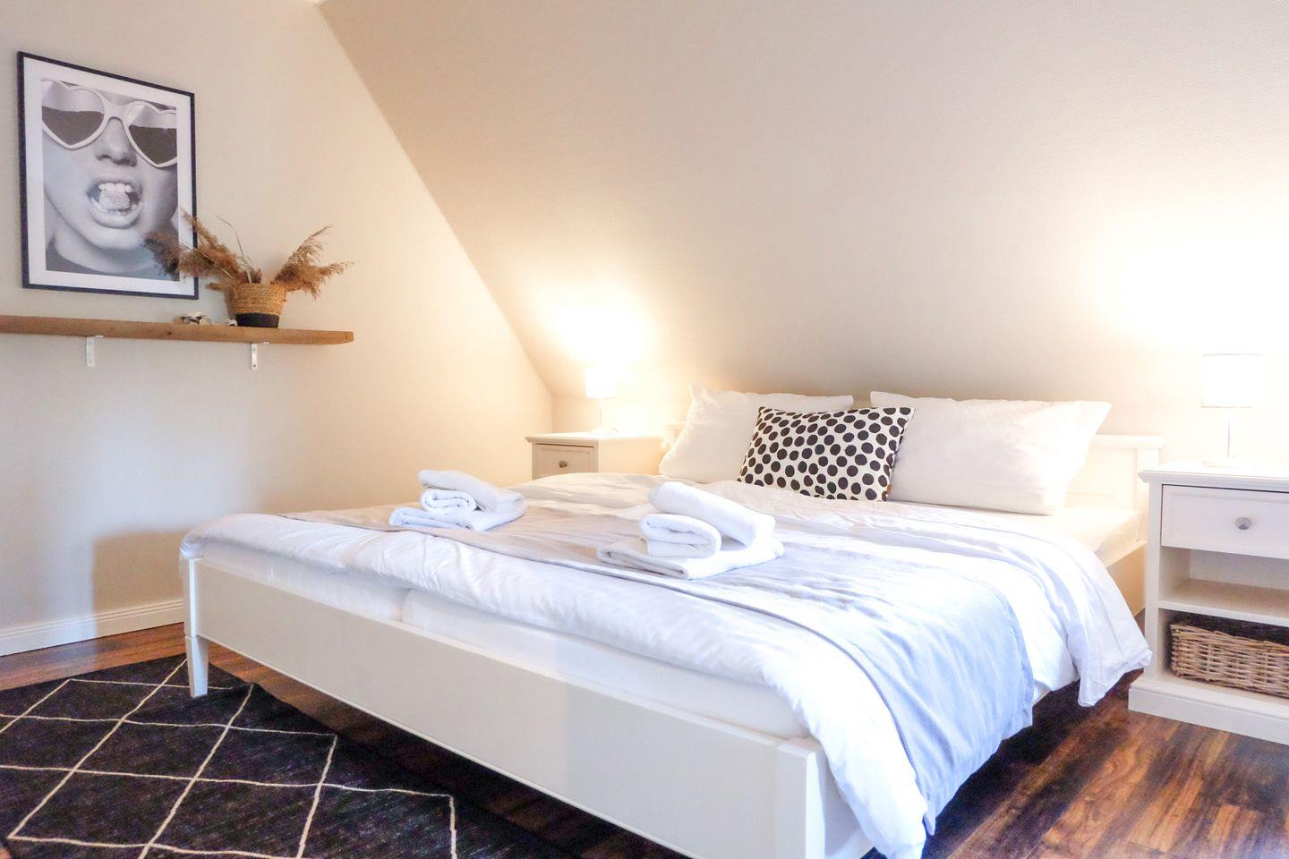 Im Obergeschoss stehen zwei große, modern eingerichtete Schlafzimmer zur Verfügung. Beide sind mit großen 180x200cm Doppelbetten sowie großzügigen Kommoden und Kleiderschränken ausgestattet.